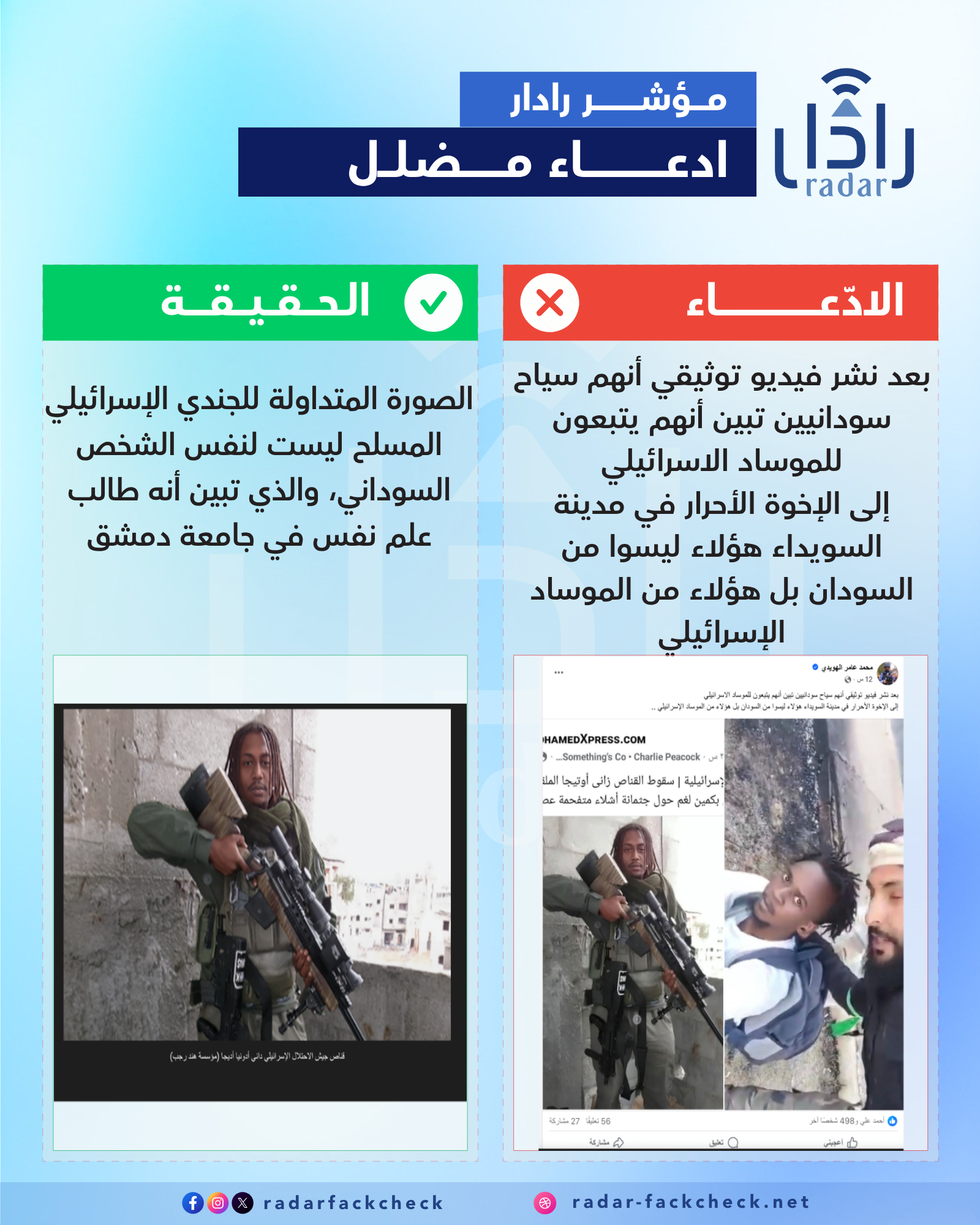تحقق فريق منصة رادار من الصورة المتداولة للجندي المسلح من خلال البحث العكسي، وتبين أنها تعود لجندي إسرائيلي متهماً بقتل أربعة مواطنيين فلسطيين في قطاع غزة، وتم رفع دعوة قضائية ضده في البرتغال، مطالبين بمحاسبته وفقاً لمبدأ الولاية القضائية العالمية. كما أن الشخص السوداني الذي ظهر في الصورة الأخرى هو مواطن سوداني يقيم في دمشق، وهو طالب في الجامعة ويدرس علم النفس، حسب مصادر محلية لرادار.