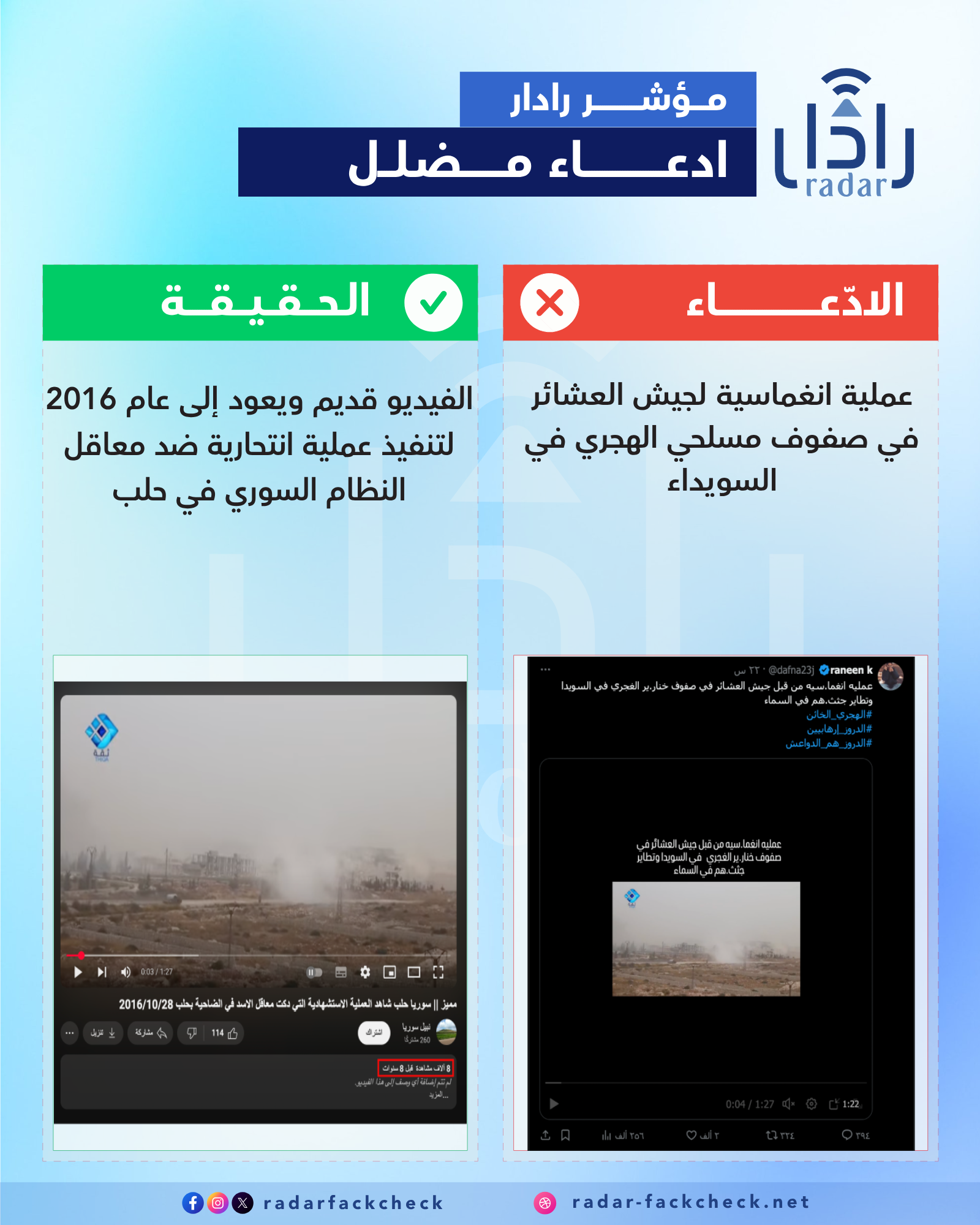 تحقق فريق منصة رادار من خلال البحث العكسي عن الفيديو المتداول، ووجد أنه قديم منذ عام 2016 لعملية "استشهادية" تم تنفيذها ضد قوات النظام البائد في حلب. ولا علاقة لها بالاحداث الحالية في السويداء.