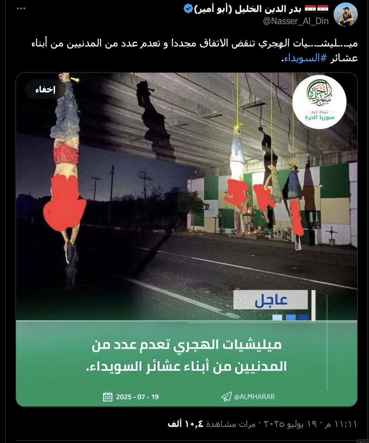 انتشر على منصة إكس صورة لعدد من الأشخاص تم تعليقهم من أرجلهم مقطوعي الرؤوس، تحت أحد الجسور، وادعى ناشروا الصورة أنها لإعدام عدد من أبناء عشائر السويداء على يد “ميليشيات الهجري”.