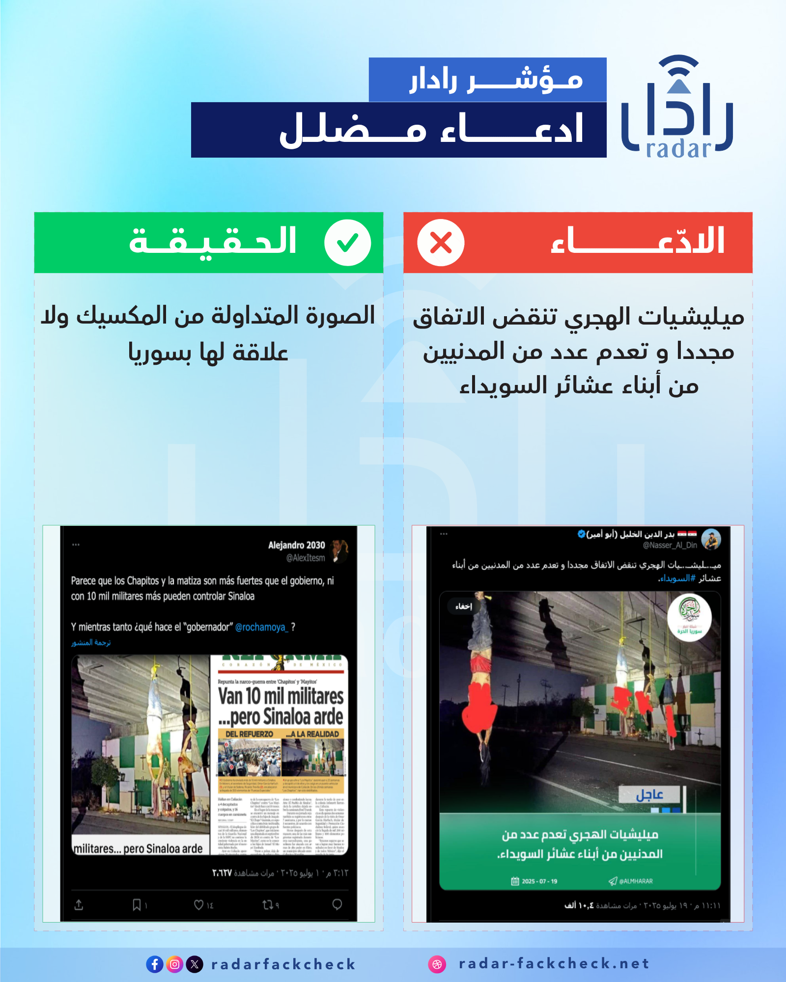 تحقق فريق منصة "رادار" من الصورة المتداولة، ومن خلال البحث العكسي تبين أنها تعود إلى ولاية سينالوا في المكسيك، ولا تمتّ بصلة إلى سوريا. وتندرج هذه الصورة ضمن سياق الحرب المستمرة منذ نحو عشرة أشهر بين عصابتي "لوس تشابيتوس" و"لوس ماييتوس". وقد تم العثور على 20 جثة في منطقة كولياكان، من بينها أربع جثث مقطوعة الرأس ومشنوقة على أحد الجسور، فيما وُجدت 16 جثة أخرى داخل شاحنة مسروقة تابعة لإحدى الشركات الخاصة.