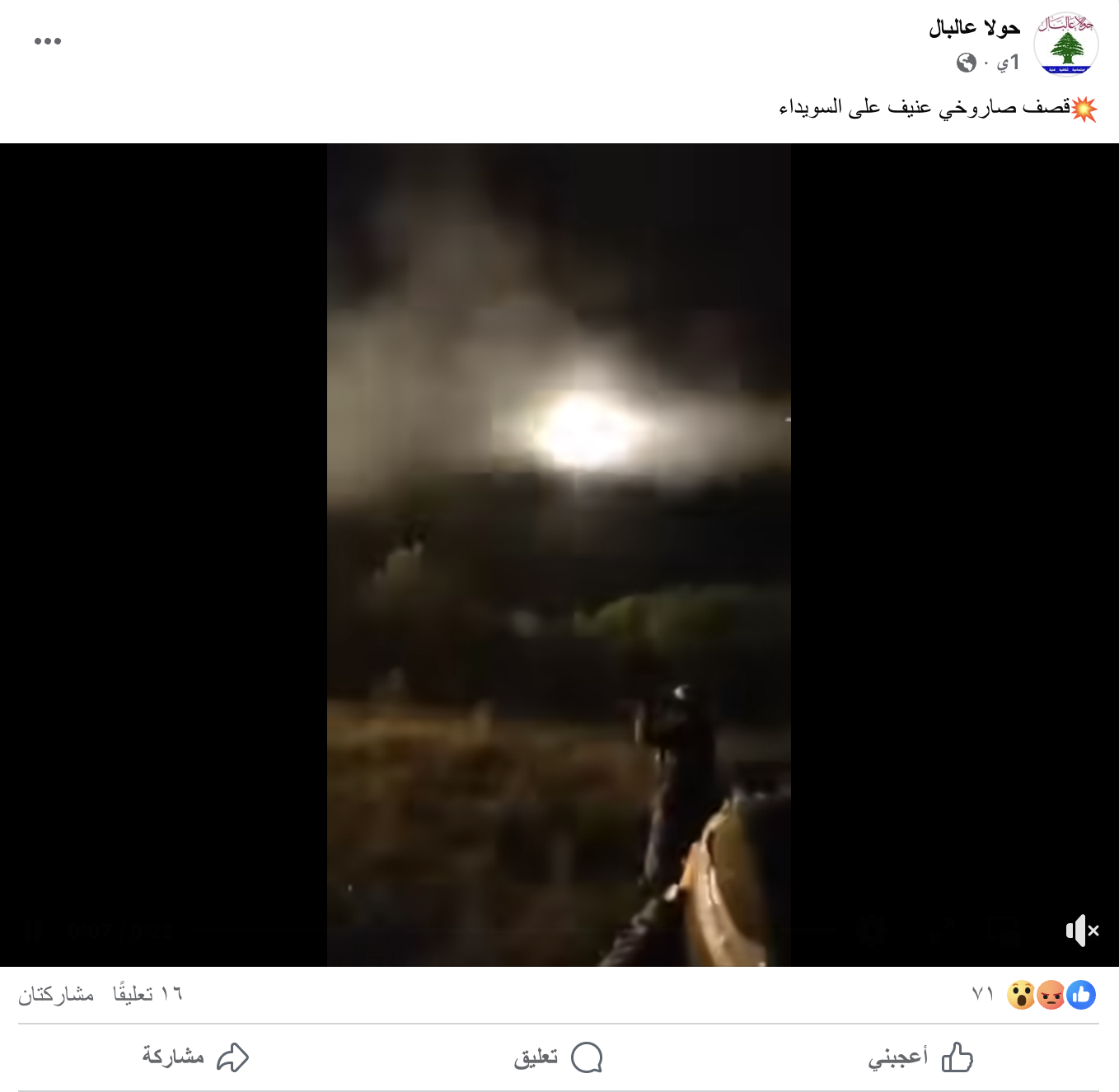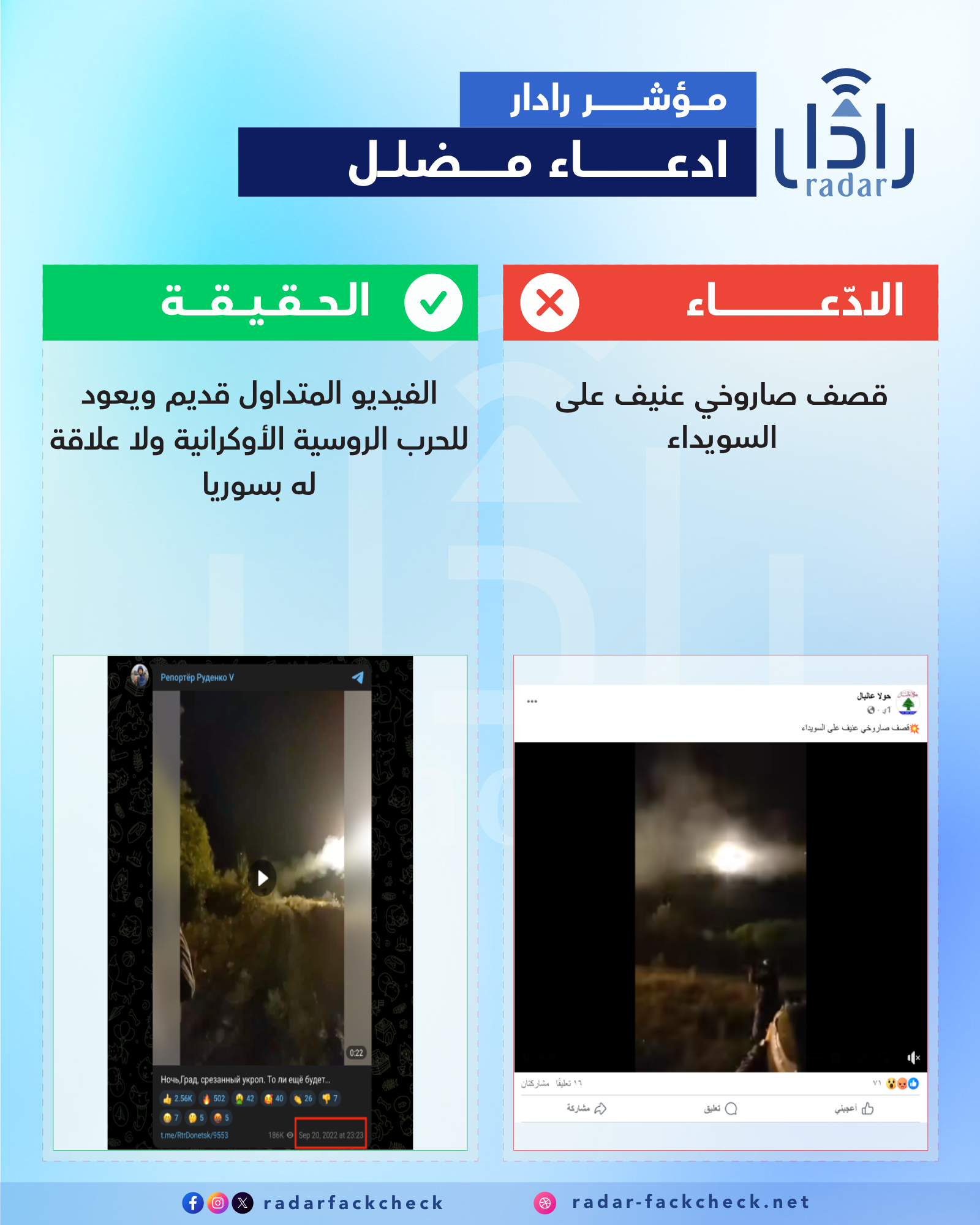 تداولت مجموعات على تطبيق واتساب إلى جانب صفحات على مواقع التواصل الاجتماعي فيديو يُظهر قصفًا صاروخيًا عنيفًا، وأُرفق بمزاعم تشير إلى أنه يُوثق قصفاً حدث مؤخرًا على محافظة السويداء جنوب سوريا.