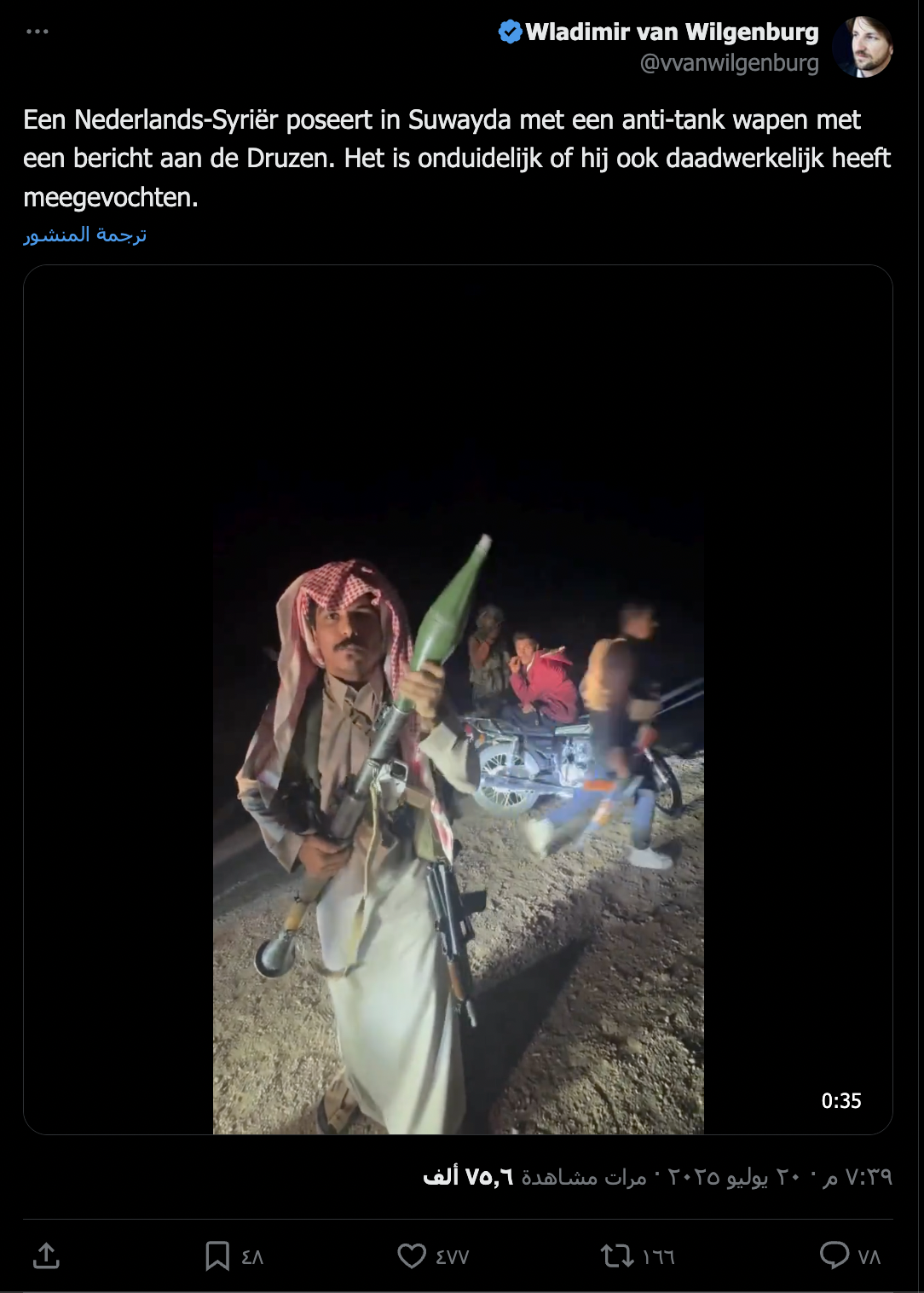 هولندي سوري يظهر في السويداء حاملاً سلاحاً مضاداً للدبابات ورسالةً إلى الدروز.
