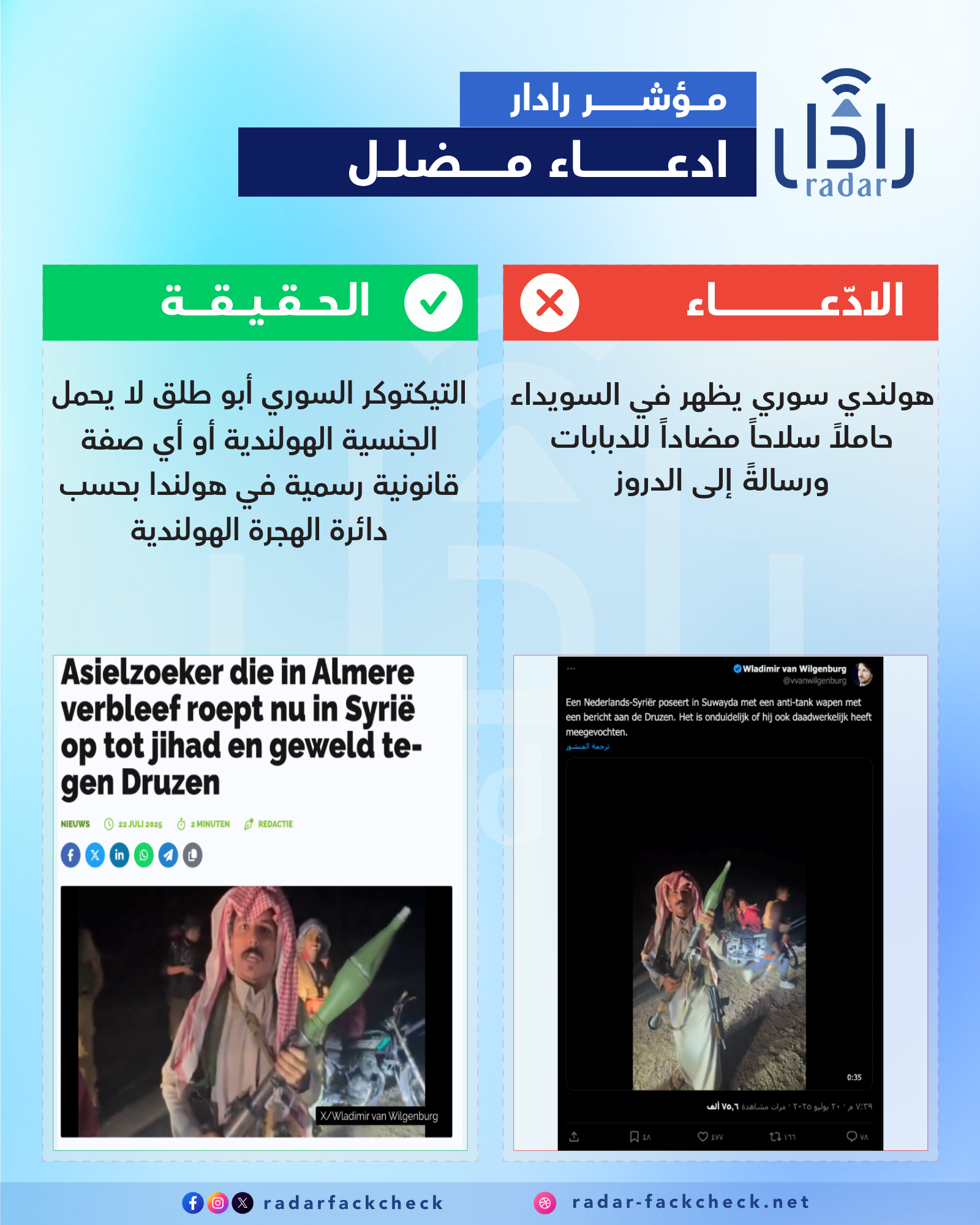 تحقق فريق منصة "رادار" من صحة الادعاءات المتداولة، وتبين أن أبو طلق لا يحمل الجنسية الهولندية من الأساس، ولا يملك أي صفة قانونية رسمية أو إقامة سارية في هولندا، وذلك بحسب تصريح رسمي من دائرة الهجرة والتجنيس الهولندية (IND)، التي أكدت: "نحن على علم بالأمر، ونقوم حالياً بالمراجعة، ونؤكد أن هذا الشخص ليس مواطناً هولندياً وليس لديه إقامة رسمية في هولندا."
