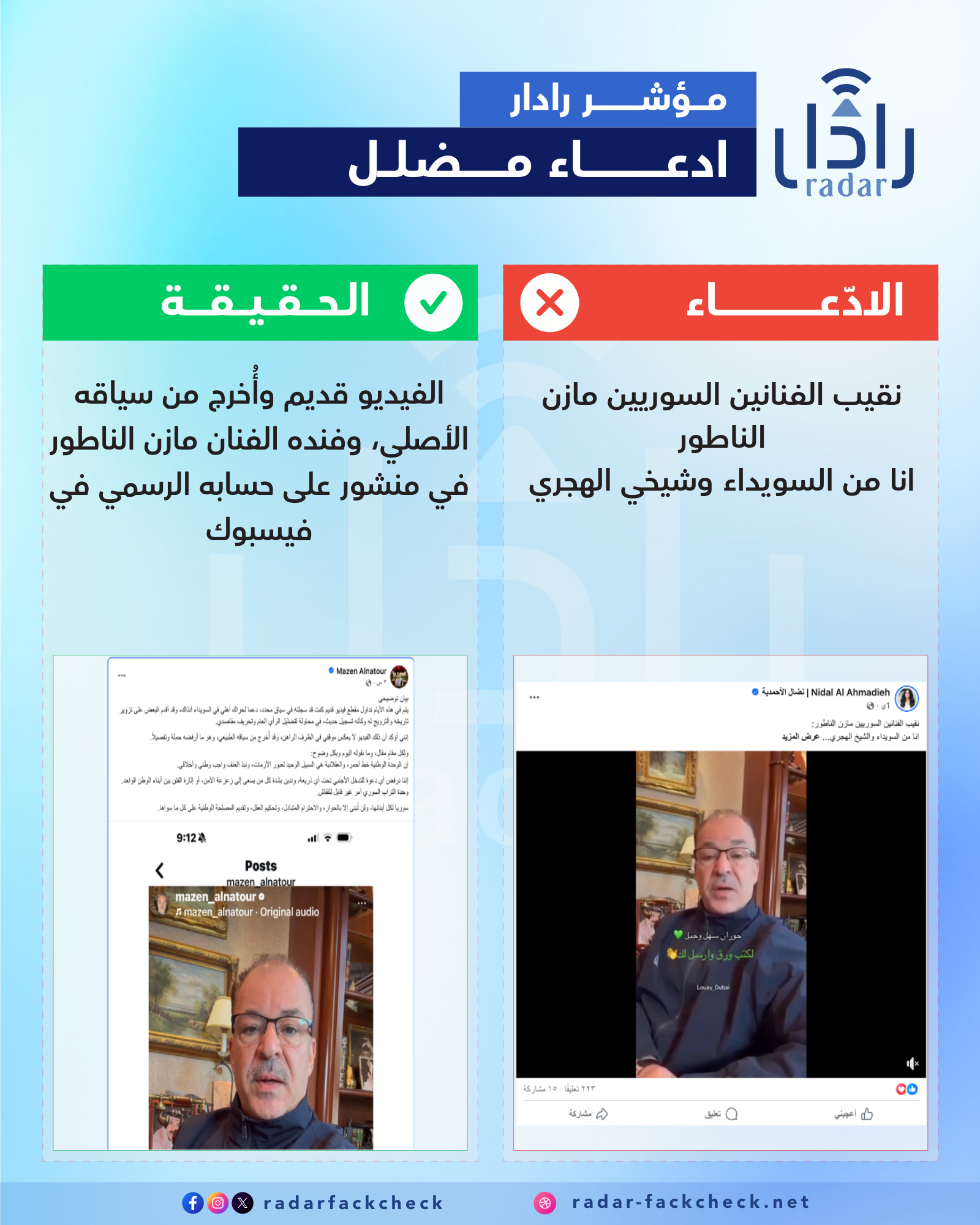 تتبعت منصة رادار الفيديو المتداول ووجدت أن الفيديو نشر على الانترنت في شهر يناير من هذا العام، ونشر مازن الناطور منشوراً على صفحته الرسمية يؤكد فيه أن الفيديو قديم وتم تسجيله سابقًا في سياق دعم لحراك أهلي في السويداء، وليس له علاقة بالوضع الراهن. وأكد أن البعض قام بـ"تزوير تاريخه والترويج له على أنه تسجيل حديث"، ما يُعد تضليلاً للرأي العام وتحريفًا لمقاصده الأصلية. وقال الناطور: "ذلك الفيديو لا يعكس موقفي في الظرف الراهن، وقد أُخرج من سياقه الطبيعي، وهو ما أرفضه جملة وتفصيلًا. لكل مقامٍ مقال، وما نقوله اليوم بوضوح: الوحدة الوطنية خط أحمر، والعقلانية السبيل الوحيد لعبور الأزمات، ونبذ العنف واجب وطني وأخلاقي." كما أكد الناطور رفضه لأي دعوة تدخل أجنبي تحت أي ذريعة، مدينًا كل من يسعى إلى زعزعة الأمن أو إثارة الفتنة بين أبناء الوطن الواحد، مشددًا على أن وحدة التراب السوري لا تقبل النقاش.