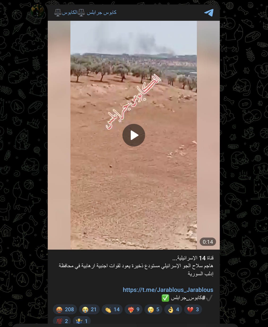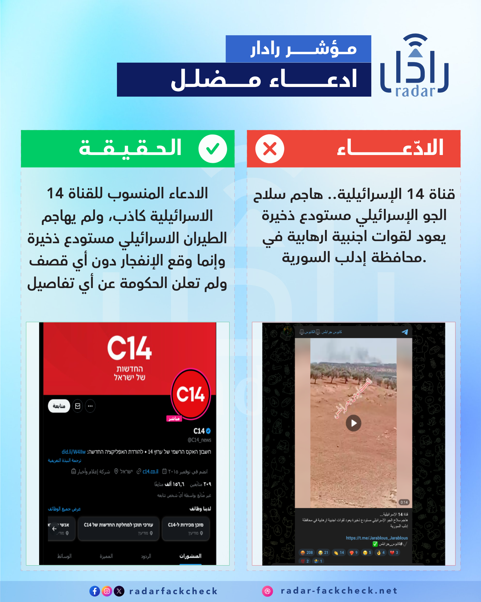 رغم تداول خبر على مواقع التواصل الاجتماعي يُزعم أنه صادر عن قناة 14 الإسرائيلية، ويدّعي أن "سلاح الجو الإسرائيلي هاجم مستودع ذخيرة يعود لقوات أجنبية إرهابية في إدلب"، إلا أن مراجعة الحسابات الرسمية والموقع الإلكتروني للقناة أظهرت أن القناة لم تنشر أي خبر بهذا الخصوص حتى لحظة إعداد هذا التقرير. وحتى الآن، لا توجد جهة رسمية أعلنت مسؤوليتها عن الهجوم، كما لم تُصدر وزارة الدفاع السورية أو أي جهة دولية بيانات تؤكد طبيعة الاستهداف أو الجهة المنفذة.