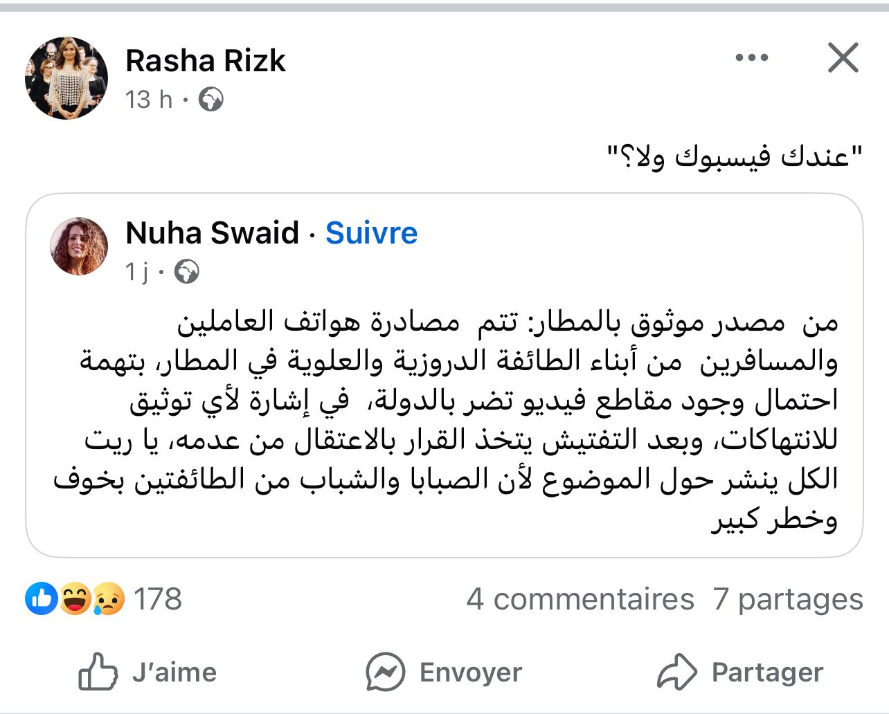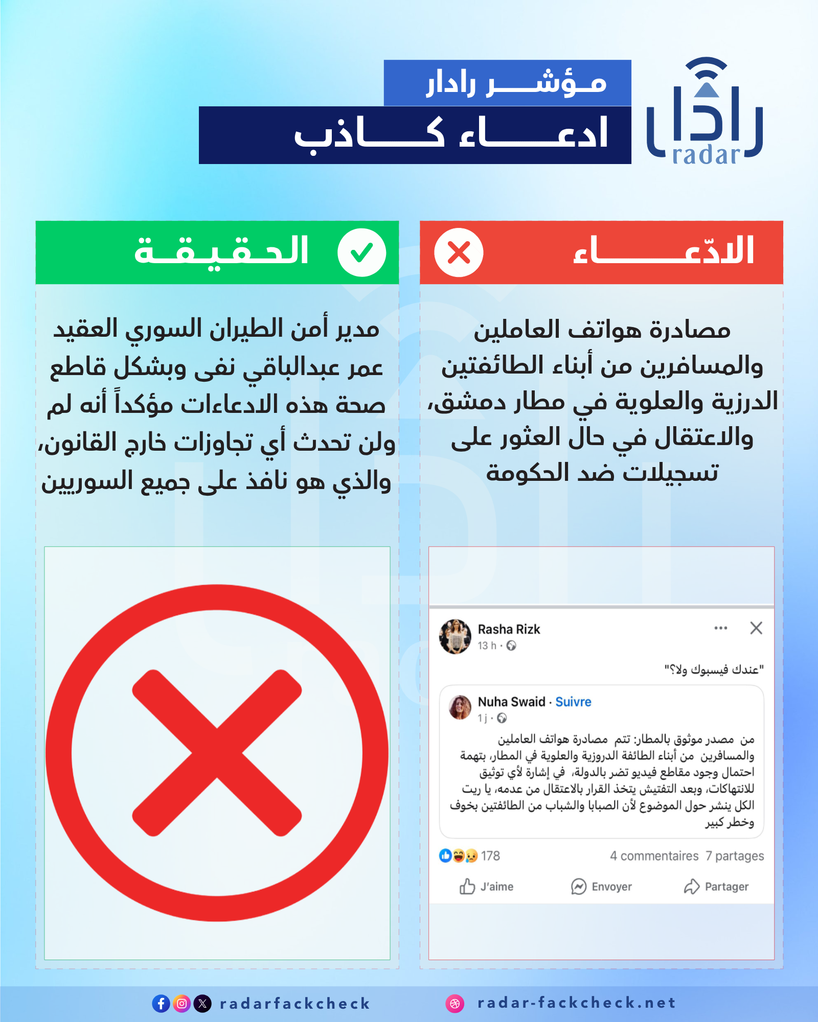 تداولت صفحات على وسائل التواصل الاجتماعي أخبارًا تزعم أن السلطات في مطارات سوريا تصادر هواتف العاملين والمسافرين من أبناء الطائفتين الدرزية والعلوية، بحجة احتمال وجود مقاطع فيديو تُضر بالدولة، وبعد التفتيش يتم اتخاذ قرار بالاعتقال من عدمه، وسط دعوات لنشر الموضوع لما يحمله من “خطر كبير على الشباب من الطائفتين”.