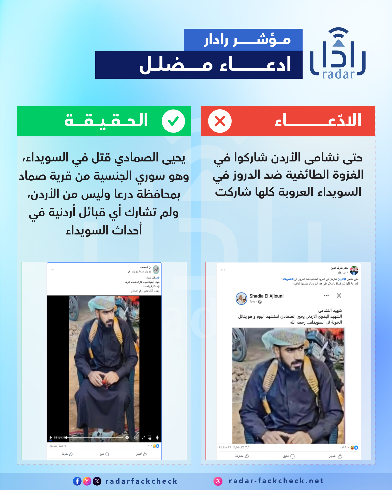 من خلال التحقق من الادعاءات وعبر البحث، تبين أن يحيى الصمادي من محافظة درعا وقتل بمحافظة السويداء، وتم تشييعه في 18 تموز 2025 في مسقط رأسه صماد، بحضور واسع من أبناء البلدة ومحيطها. وقد ورد في نص النعي الرسمي: "تزف لكم قرية صماد شهيدها الشاب يحيى زكي الصمادي... شهيد البطولة والكرامة والشرف." والترويج لانتمائه لعشائر أردنية لا يستند إلى أي مصدر موثوق، ويُعد من أشكال تحريف الهوية والمعلومة لأغراض إعلامية أو سياسية غير واضحة.