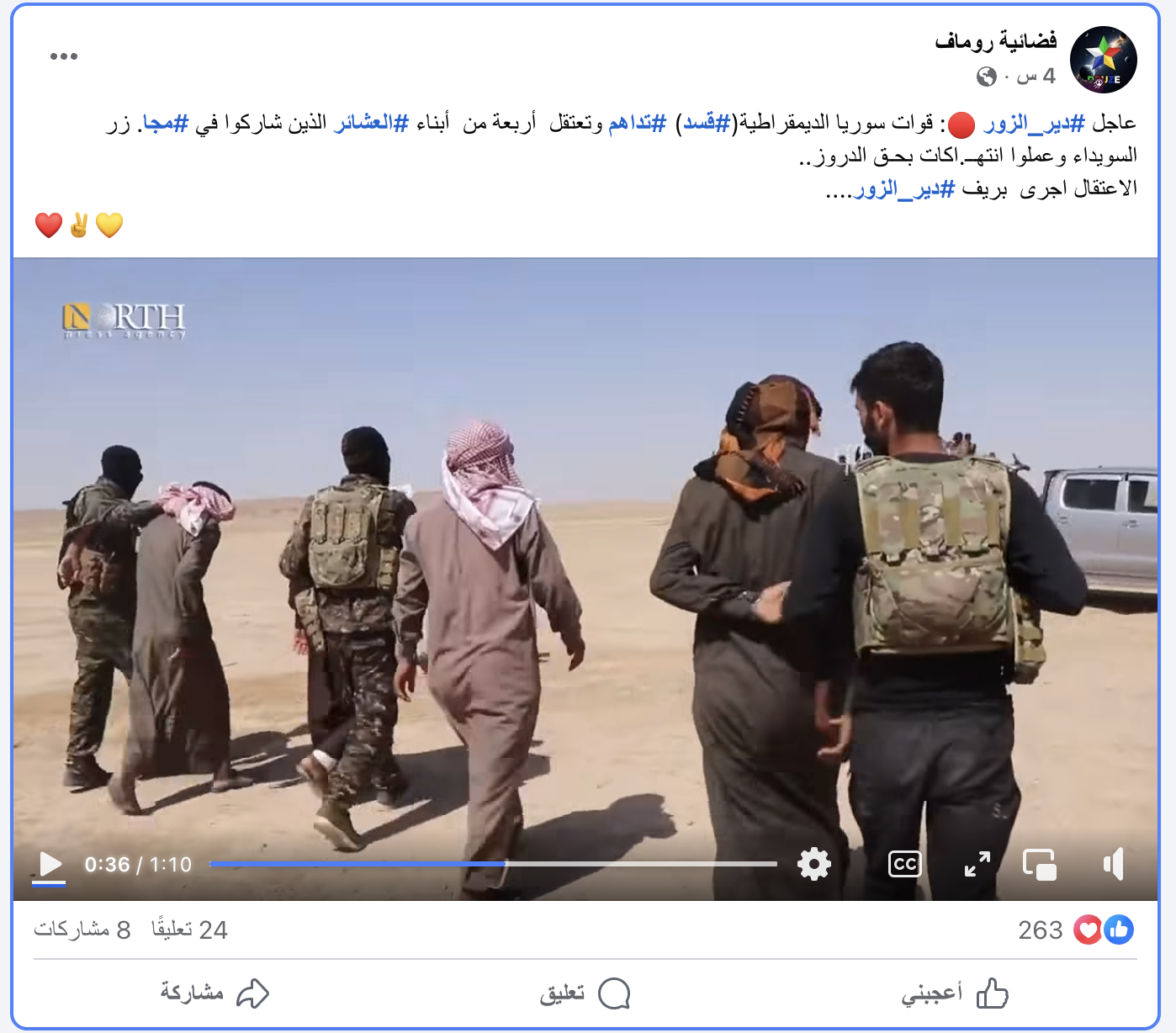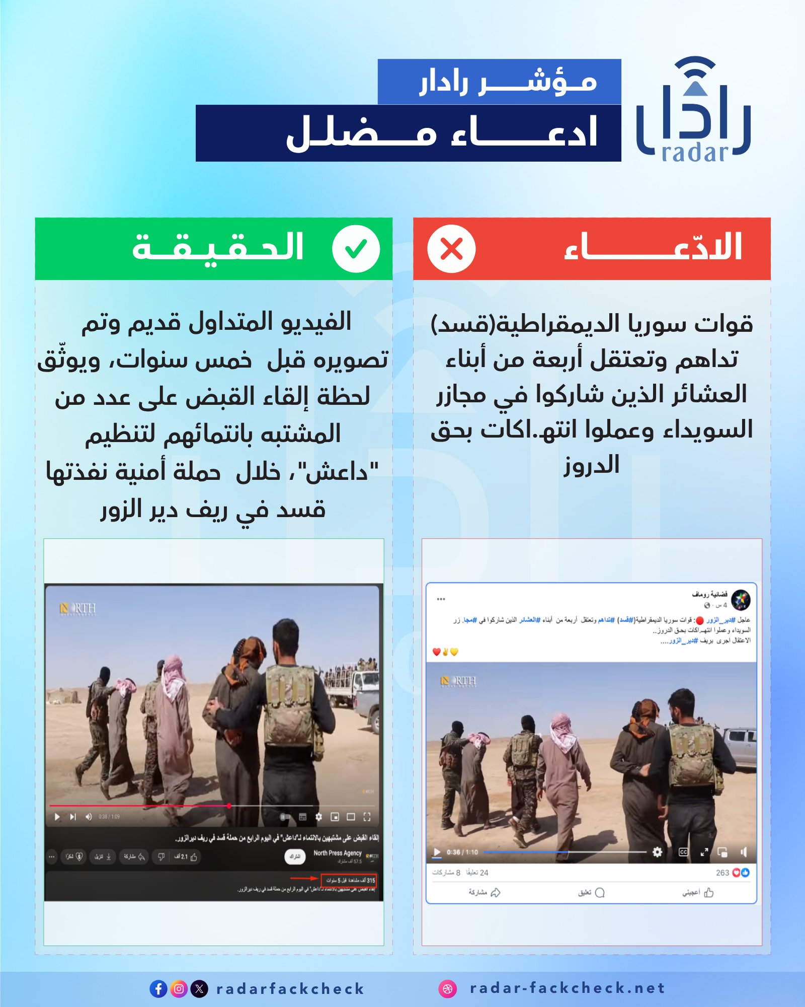 نشرت صفحات على فيس بوك فيديو يدعي أن قوات سوريا الديمقراطية(قسد) تداهم وتعتقل أربعة من أبناء العشائر الذين شاركوا في مجازر السويداء وعملوا انتهــ.اكات بحـق الدروز.