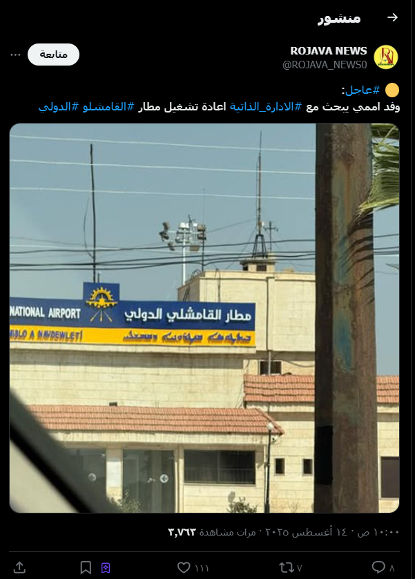 تداولت حسابات وصفحات كردية على منصات التواصل الاجتماعي، خبرا حول بحث وفد أممي مع الإدارة الذاتية إعادة تشغيل مطار القامشلي الدولي.