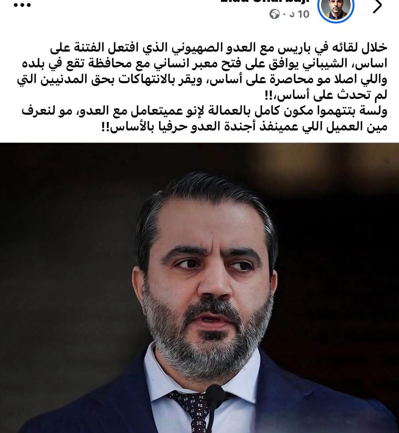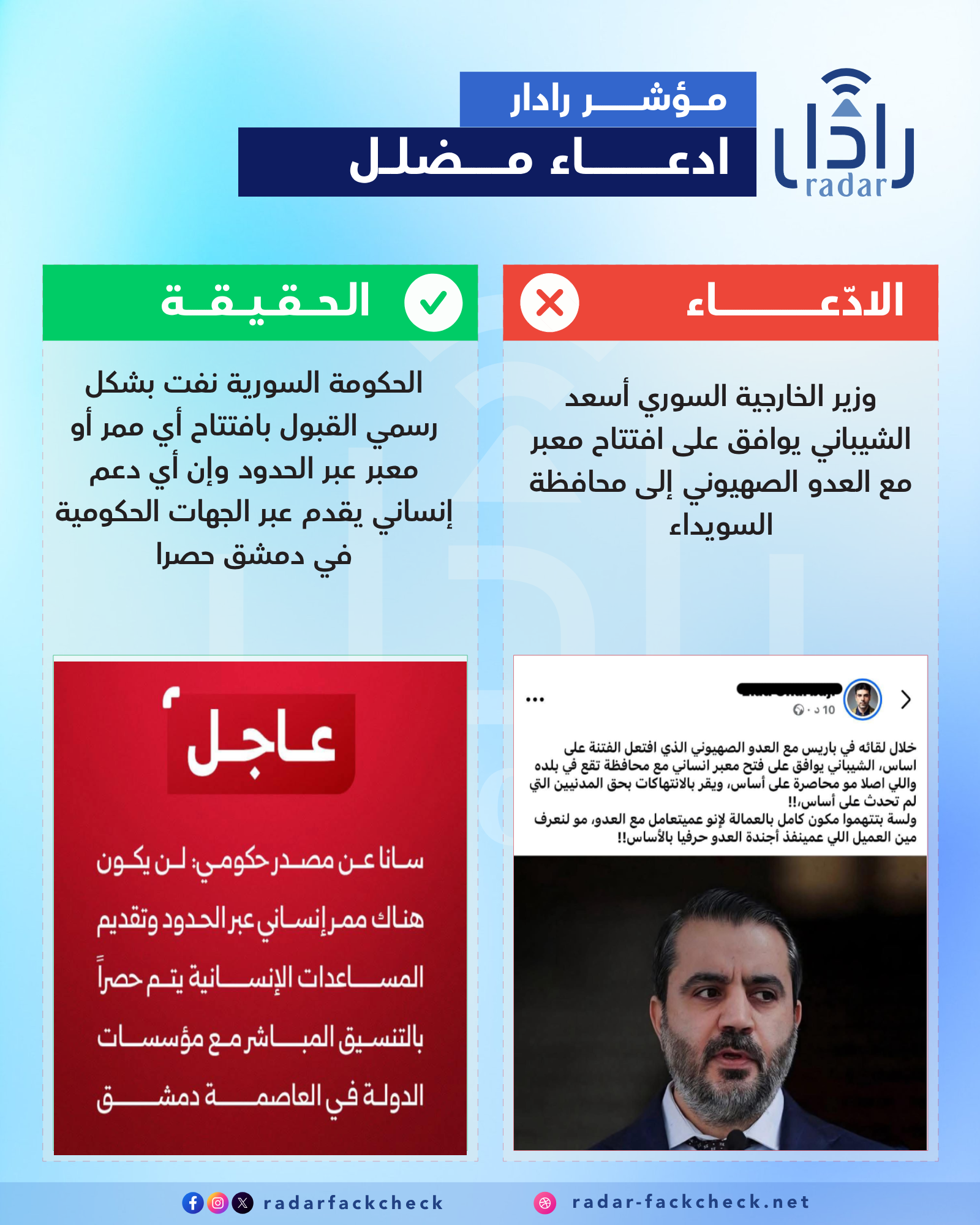 تداولت حسابات سورية على منصة فيسبوك، خبرا مفاده أن وزير الخارجية السوري أسعد الشيباني، وافق على افتتاح معبر مع الكيان الإسرائيلي إلى محافظة السويداء، وذلك بعد مفاوضات مع وزير الشؤون الإستراتيجية الإسرائيلي في باريس.