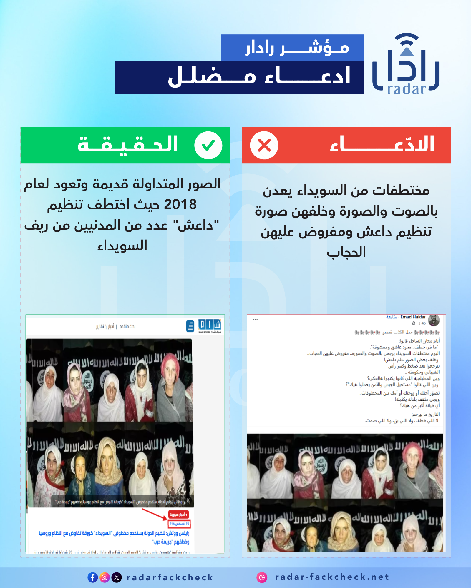 تداولت حسابات سورية على فيسبوك، اليوم السبت، صور لنساء من مدينة السويداء، ادعا ناشروها أنها لمختطفات من المحافظة خلال الأحداث الأخيرة، وتم إجبارهن على الحجاب والتقاط صورة وخلفهن راية تنظيم “داعش”.