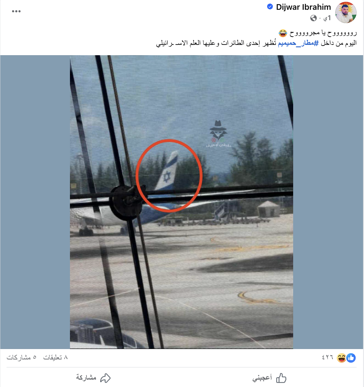 تداول رواد مواقع التواصل الاجتماعي صورة لطائرة إسرائيلية قالوا أنها من داخل مطار حميميم في اللاذقية.