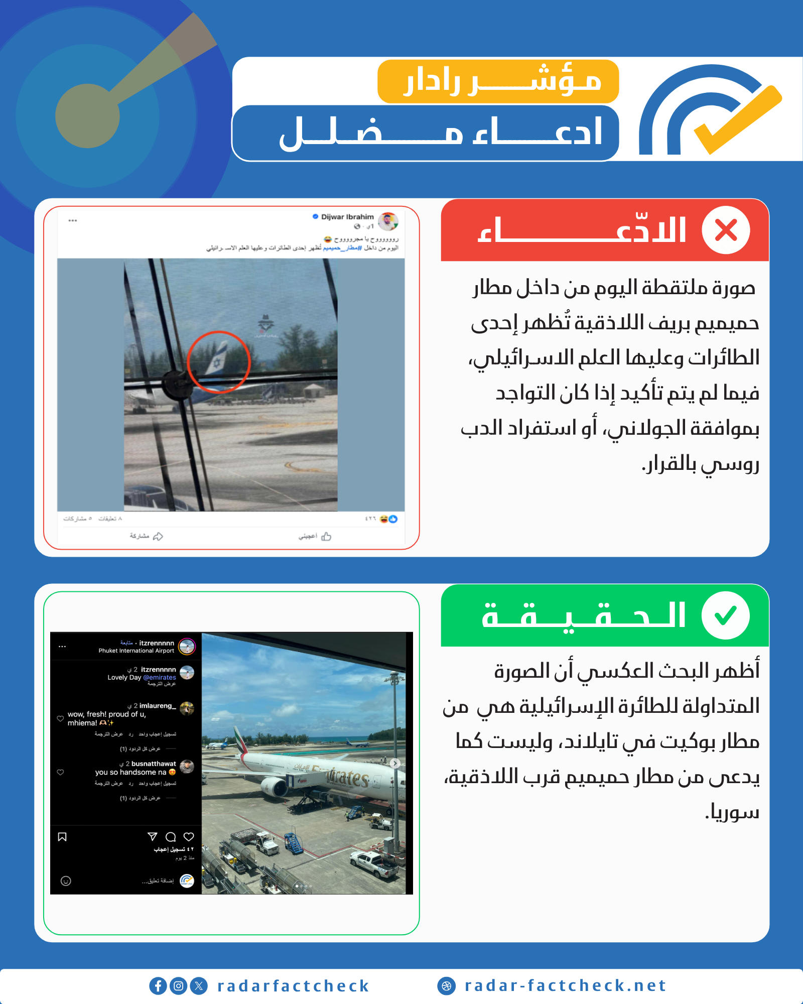 من خلال البحث المتقدم عبر منصة "إنستغرام"، عثر فريقنا على النسخة الأصلية من الصورة، والتي نُشرت قبل يومين فقط في 13/09/2025 من قبل أحد المسافرين في مطار "بوكيت" الدولي في تايلاند. وكشف التدقيق البصري أن الصورة المتداولة في السياق السوري هي نسخة "مقتطعة" من الصورة الأصلية، تم التلاعب بها لإخفاء معالم المطار التايلاندي. وبناءً على ما سبق، نؤكد أنه لم تُسجل حركة هبوط لأي طائرة إسرائيلية في مطار حميميم، والصورة لا علاقة لها بالجغرافيا السورية.