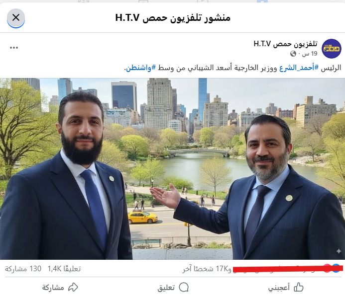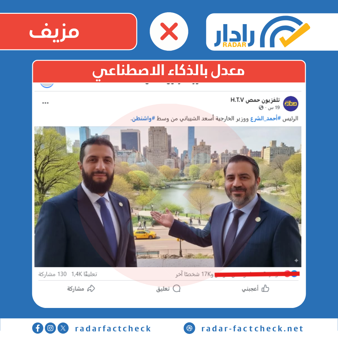 تداولت حسابات وصفحات سورية على منصة فيسبوك، صورة تظهر الرئيس السوري أحمد الشرع رفقة وزير الخارجية أسعد الشيباني، مدعين أنهم في الولايات المتحدة الأمريكية.