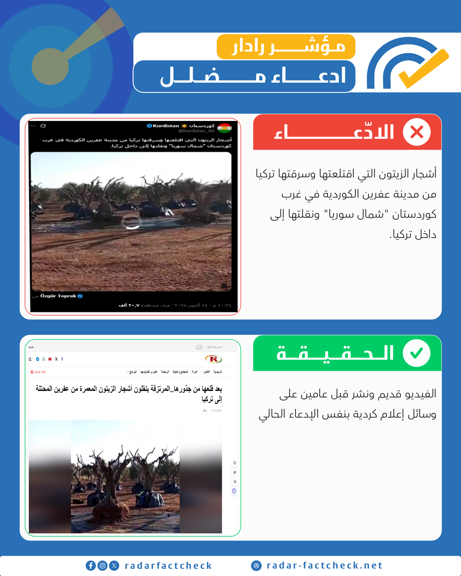 تحققت منصة "رادار" من المقطع المتداول، وتبيّن أنه مضلل. ومن خلال البحث العكسي واستخدام تقنيات تتبع المحتوى الرقمي، وجد فريقنا أن الفيديو قديم جداً، حيث سبق نشره قبل عامين بنفس صيغة الادعاء الحالية. كما أجرى فريقنا سلسلة من عمليات الاستقصاء والبحث في المصادر الرسمية والميدانية، ولم يتم العثور على أي دليل أو مصدر موثوق يدعم صحة الأنباء المتداولة حول نقل أشجار زيتون من سوريا إلى تركيا في الوقت الراهن.