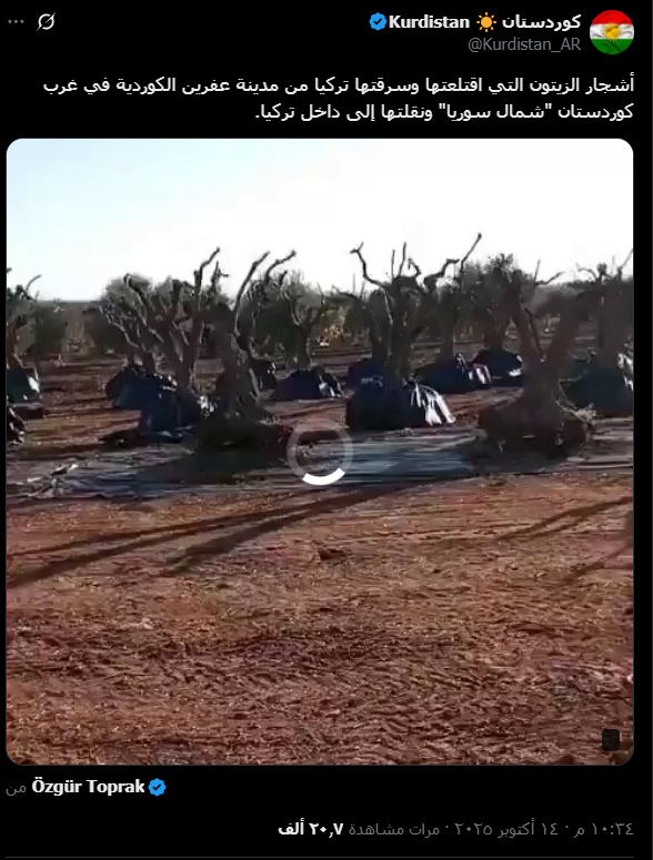 تداولت حسابات على منصة إكس مقطع فيديو يظهر أشجار زيتون بعد اقتلاعها من الأرض، وقالت إنها لعملية نقلها إلى تركيا بعد اقتلاعها من مدينة عفرين شمال غرب سوريا.