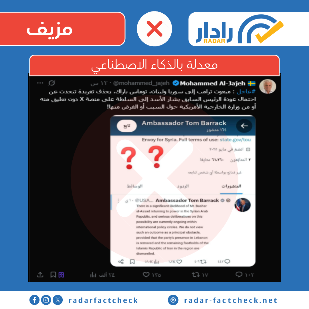 تداولت حسابات على منصة إكس، صورة تظهر تغريدة منسوبة للمبعوث الأمريكي لسوريا توماس باراك تحدث فيها عن احتمالية عودة بشار الأسد إلى السلطة.