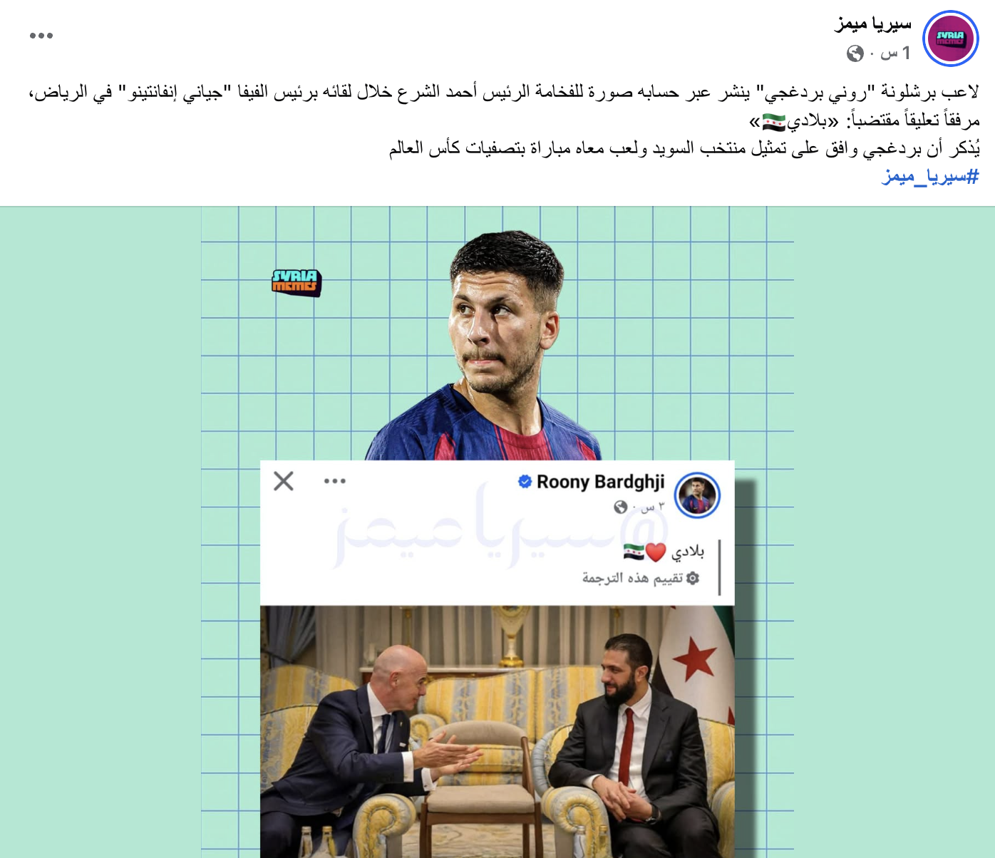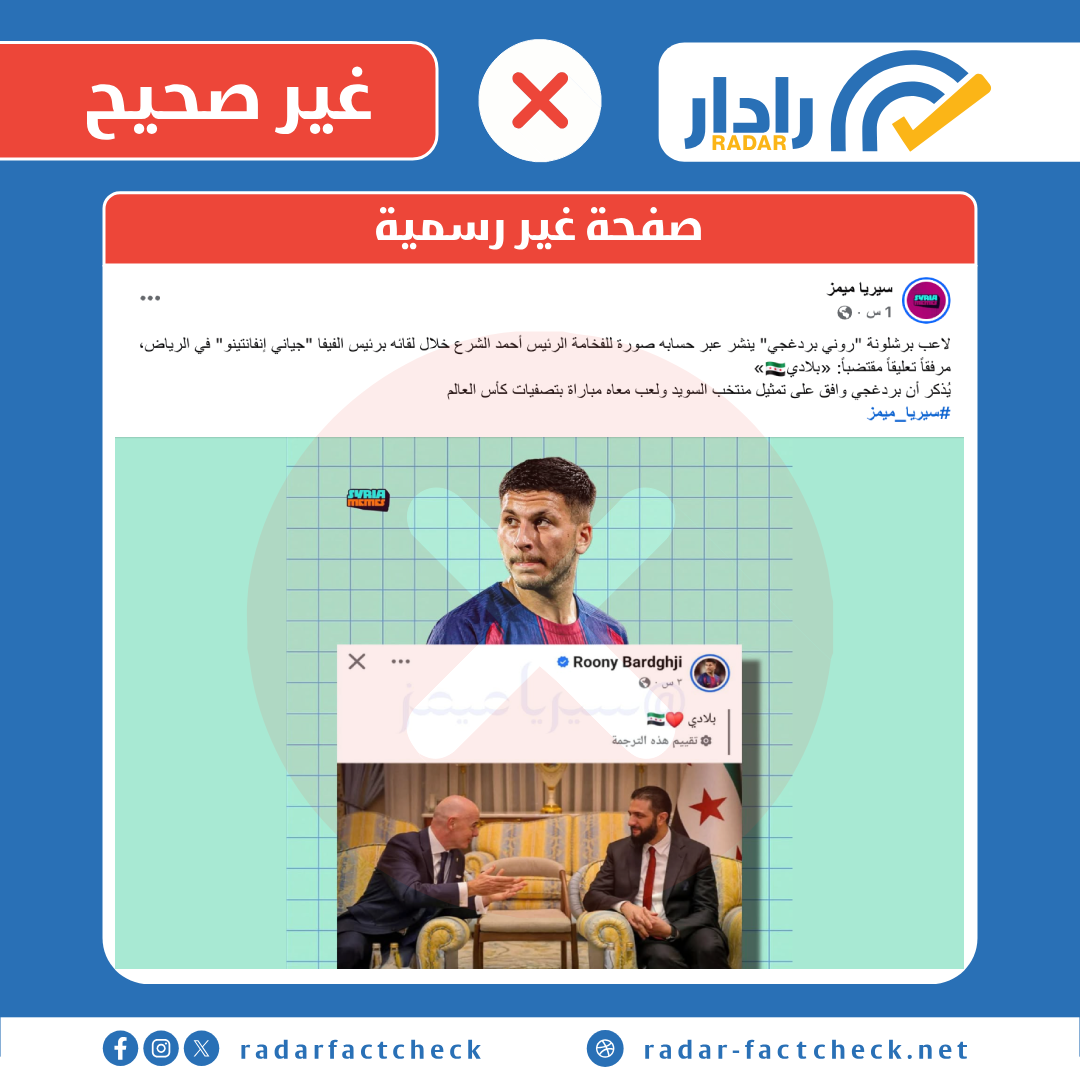 تداولت صفحات على موقع فيسبوك منشوراً نُسب إلى لاعب نادي برشلونة الإسباني روني بردغجي، زُعم فيه أنه نشر عبر حسابه صورة تجمع الرئيس أحمد الشرع مع رئيس الاتحاد الدولي لكرة القدم جياني إنفانتينو خلال لقائهما في الرياض، مرفقاً بتعليق «بلادي 🇸🇾».