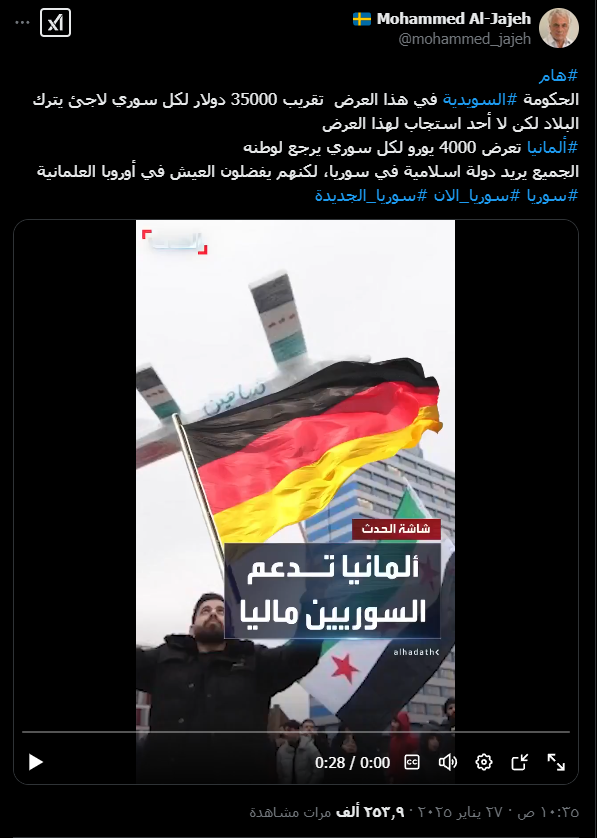 تداول مستخدمون على منصة إكس، معلومات تفيد أن الحكومة السويدية تعتزم منح كل لاجئ سوري يريد العودة طوعياً إلى بلاده مبلغا قدره 35 ألف دولار، فيما ستمنح ألمانيا مبلغا وقدره 4000 يورو.