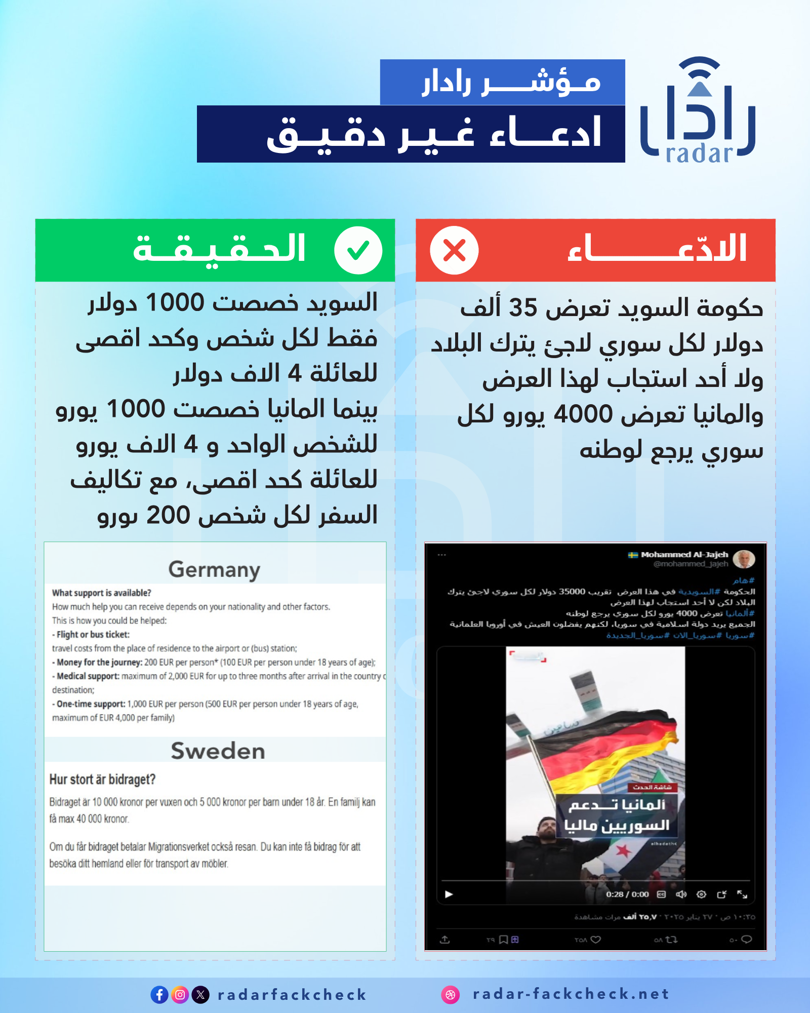 بحث فريق منصة رادار عن أصل هذه المعلومات وتبين أنها غير دقيقة ولم يعلن عنها من أي جهة حكومية رسمية في السويد أو المانيا. وفي تفاصيل البحث تبين أنه، خصصت الحكومة السويدية وضمن برنامج العودة الطوعية، مبلغا وقدره 10000 كرونة سويدية لكل شخص بالغ و5000 كرونة سويدية لكل طفل لم يبلغ الـ 18 عامًا؛ بحيث تحصل الأسرة على مبلغ لا يتجاوز الـ 40,000 كرونة سويدية. والحكومة الألمانية خصصت مبلغ 1000 يورو للشخص البالغ و 500 يورو لمن هم دون 18 عاماً ويصرف لمرة واحدة، والمبلغ الكلي للعائلة لا يتجاوز 4000 يورو.