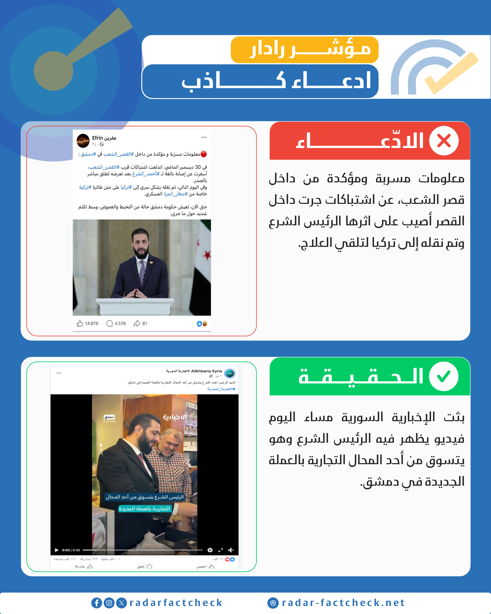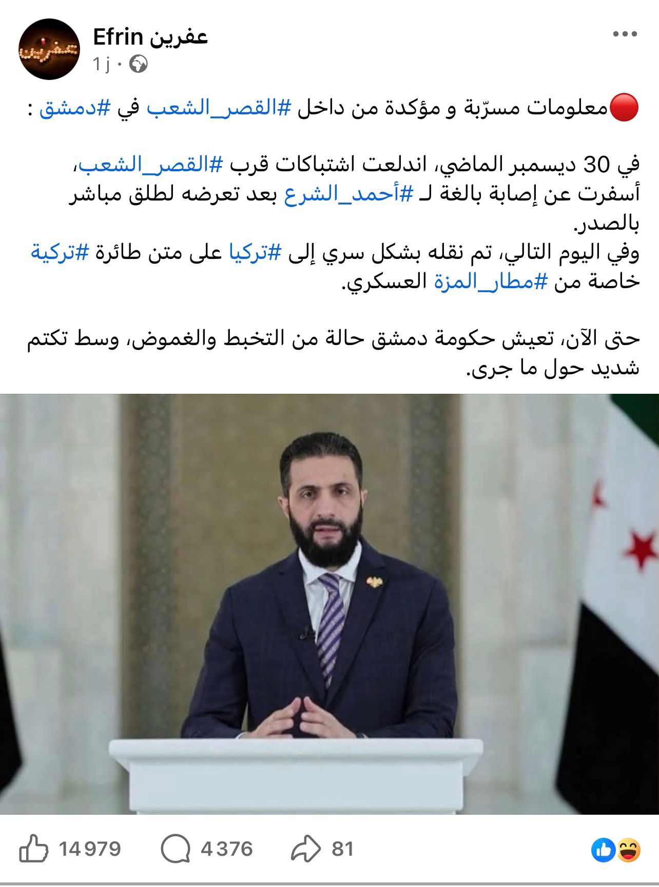 تداولت صفحات على منصات التواصل الاجتماعي خبرًا يزعم وقوع اشتباكات قرب القصر الشعبي في دمشق بتاريخ 30 كانون الأول، أسفرت عن إصابة بالغة للرئيس السوري أحمد الشرع بطلق ناري في الصدر، وأنه جرى نقله سرًا في اليوم التالي إلى تركيا على متن طائرة تركية خاصة من مطار المزة العسكري.