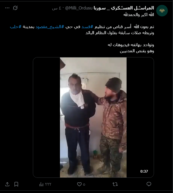 نشرت حسابات وصفحات على منصات التواصل الاجتماعي خبراً مفاده أن الأمن العام قام بأسر قناص من قسد في حي الشيخ مقصود وله صلات سابقة بالنظام البائد، وعلى هاتفه الشخصي يوجد مقاطع فيديو تثبت أنه كان يوثق عمليات القنص التي كان يقوم بها ضد المدنيين.