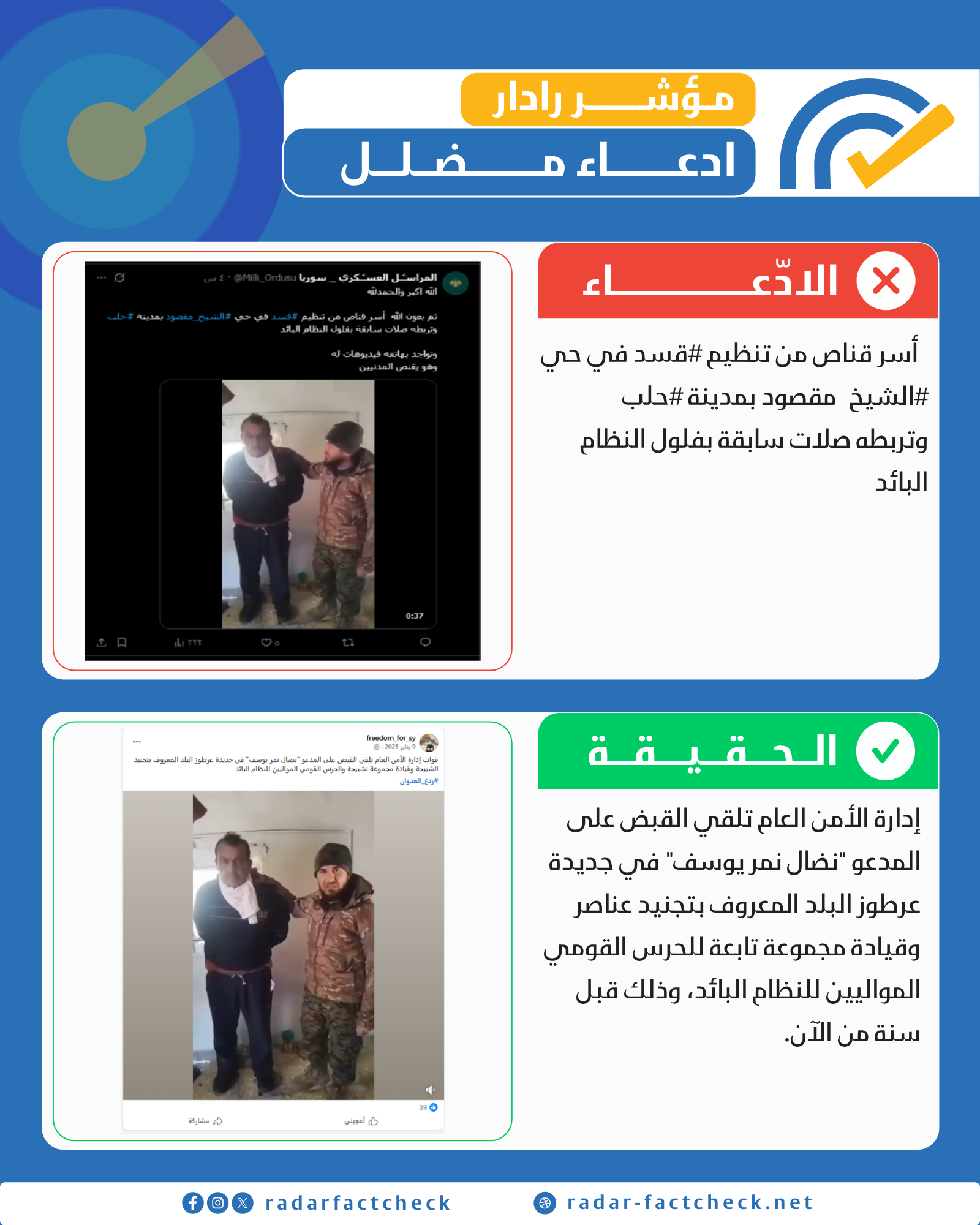 أجرى فريق منصة رادار عملية تدقيق للفيديو المتداول، وتبيّن أن المقطع لا يوثّق أسر قنّاص تابع لقسد كما يُشاع. بعد التحقق واستخدام البحث العكسي، والبحث بالكلمات المفتاحية، تبيّن أن الفيديو يعود إلى عملية إلقاء القبض التي نفذتها إدارة الأمن العام بحق المدعو نضال نمر يوسف في جديدة عرطوز البلد، المعروف بتجنيد عناصر وقيادة مجموعة تابعة لما يُسمّى بـالحرس القومي الموالي للنظام البائد، وذلك قبل نحو عام من تاريخ تداوله الحالي.