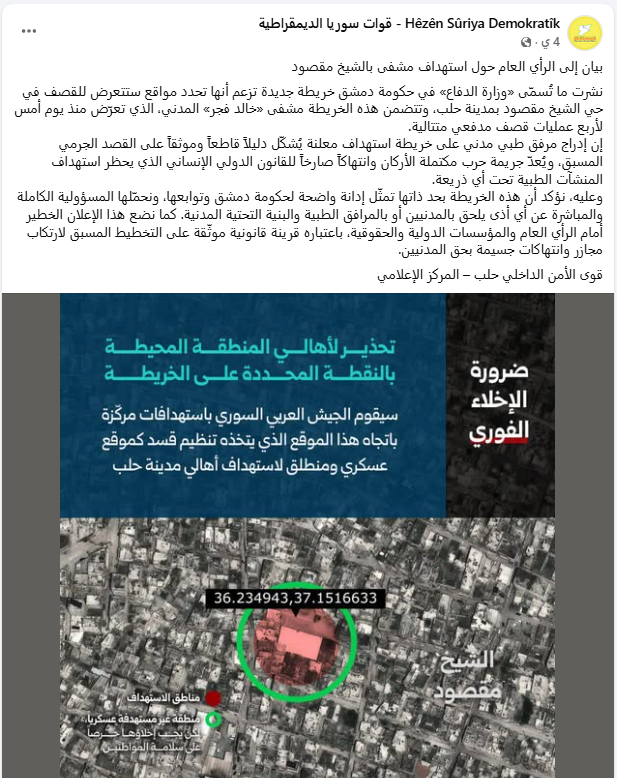 نشرت ما تُسمّى «وزارة الدفاع» في حكومة دمشق خريطة جديدة تزعم أنها تحدد مواقع ستتعرض للقصف في حي الشيخ مقصود بمدينة حلب، وتتضمن هذه الخريطة مشفى «خالد فجر» المدني، الذي تعرّض منذ يوم أمس لأربع عمليات قصف مدفعي متتالية. إن إدراج مرفق طبي مدني على خريطة استهداف معلنة يُشكّل دليلاً قاطعاً وموثقاً على القصد الجرمي المسبق، ويُعدّ جريمة حرب مكتملة الأركان وانتهاكاً صارخاً للقانون الدولي الإنساني الذي يحظر استهداف المنشآت الطبية تحت أي ذريعة.