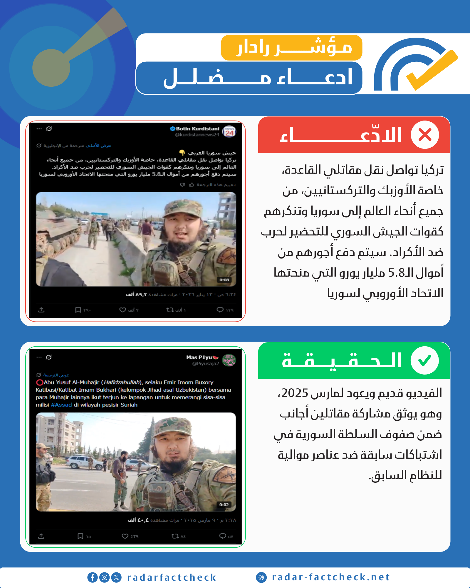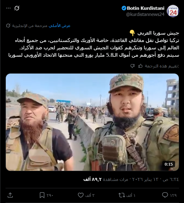 تداولت حسابات على منصة (X) ادعاءات تزعم أن تركيا تنقل مقاتلين من تنظيم القاعدة (أوزبك وتركستانيين) إلى سوريا، وتنكّرهم بزي الجيش السوري للتحضير لحرب ضد الأكراد، مع مزاعم بدفع أجورهم من أموال المنحة الأوروبية.