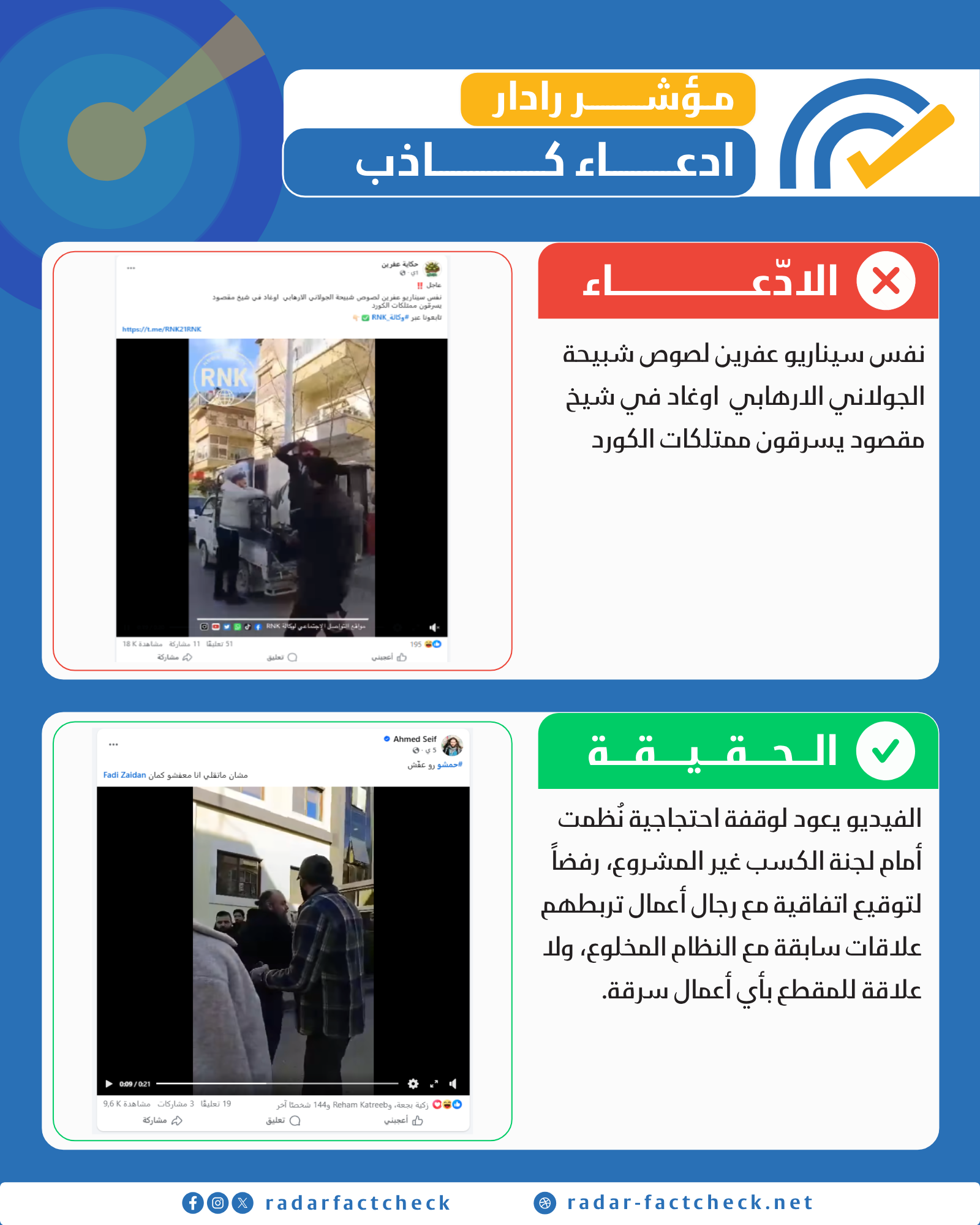 تحققت منصة رادار من الفيديو المتداول، ومن خلال البحث العكسي وتقصي الحقائق، تبين أن الفيديو مضلل. المقطع في الحقيقة يعود لوقفة احتجاجية نُظمت قبل أيام للتعبير عن رفض توقيع اتفاقية تسوية ومصالحة مع رجال أعمال يُعتقد بارتباطهم بعلاقات سابقة مع النظام السوري السابق. كما أجرى فريقنا رصداً ميدانياً ومتابعة للمصادر المحلية في مدينة حلب وحي الشيخ مقصود تحديداً، ولم يتم العثور على أي معلومات أو صور أو بلاغات توثق حدوث عمليات سرقة ممنهجة للممتلكات كما ورد في الادعاء.
