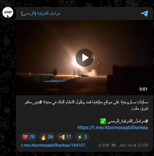 تداولت حسابات وقنوات على منصة “تلغرام” مقطع فيديو يوثق رشقات صاروخية عنيفة، وزعم ناشرون أنه يعود لعمليات قصف بري يستهدف مواقع “قوات سوريا الديمقراطية” (قسد) في منطقة دير حافر بريف حلب الشرقي، وذلك ضمن التطورات العسكرية الأخيرة في المنطقة.