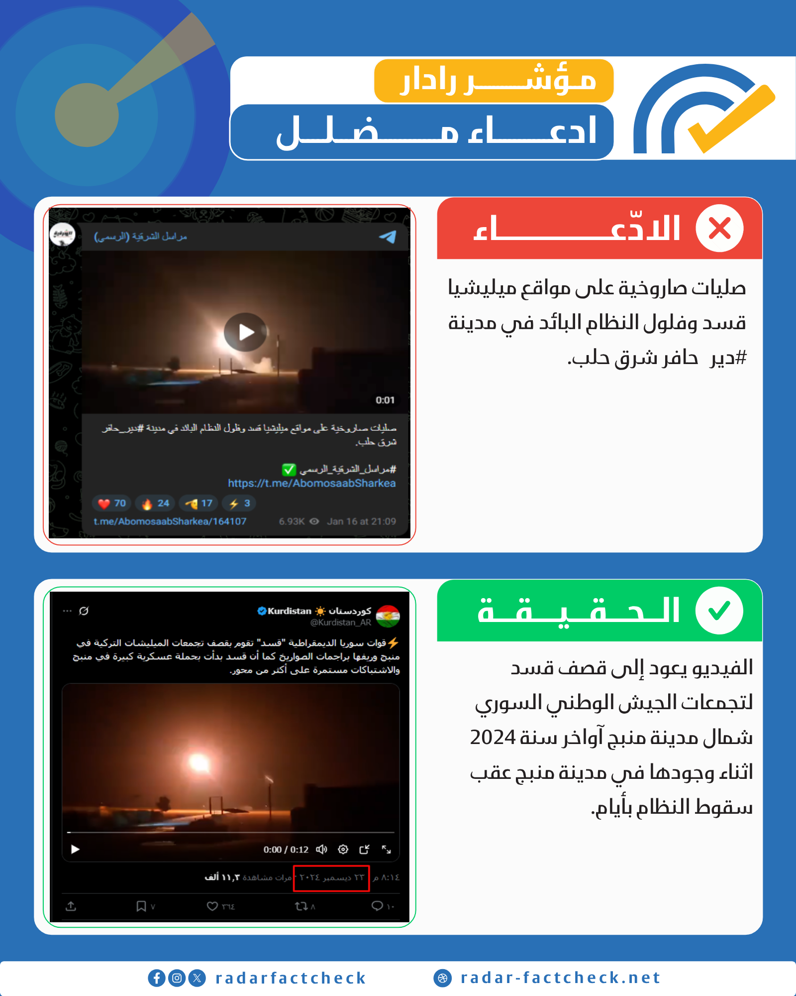 أجرت منصة "رادار" عملية بحث عكسي وتقصٍّ عن الفيديو المتداول باستخدام الكلمات المفتاحية، وتبين أن الادعاء مضلل. المقطع قديم ويعود لعام 2024، وهو يوثق قصفاً نفذته "قسد" باتجاه مواقع "الجيش الوطني" شمال مدينة منبج، خلال محاولة الأخير التقدم نحو المدينة في أعقاب سقوط النظام السوري في ديسمبر 2024، ولا علاقة للفيديو بالأحداث الجارية حالياً في دير حافر.