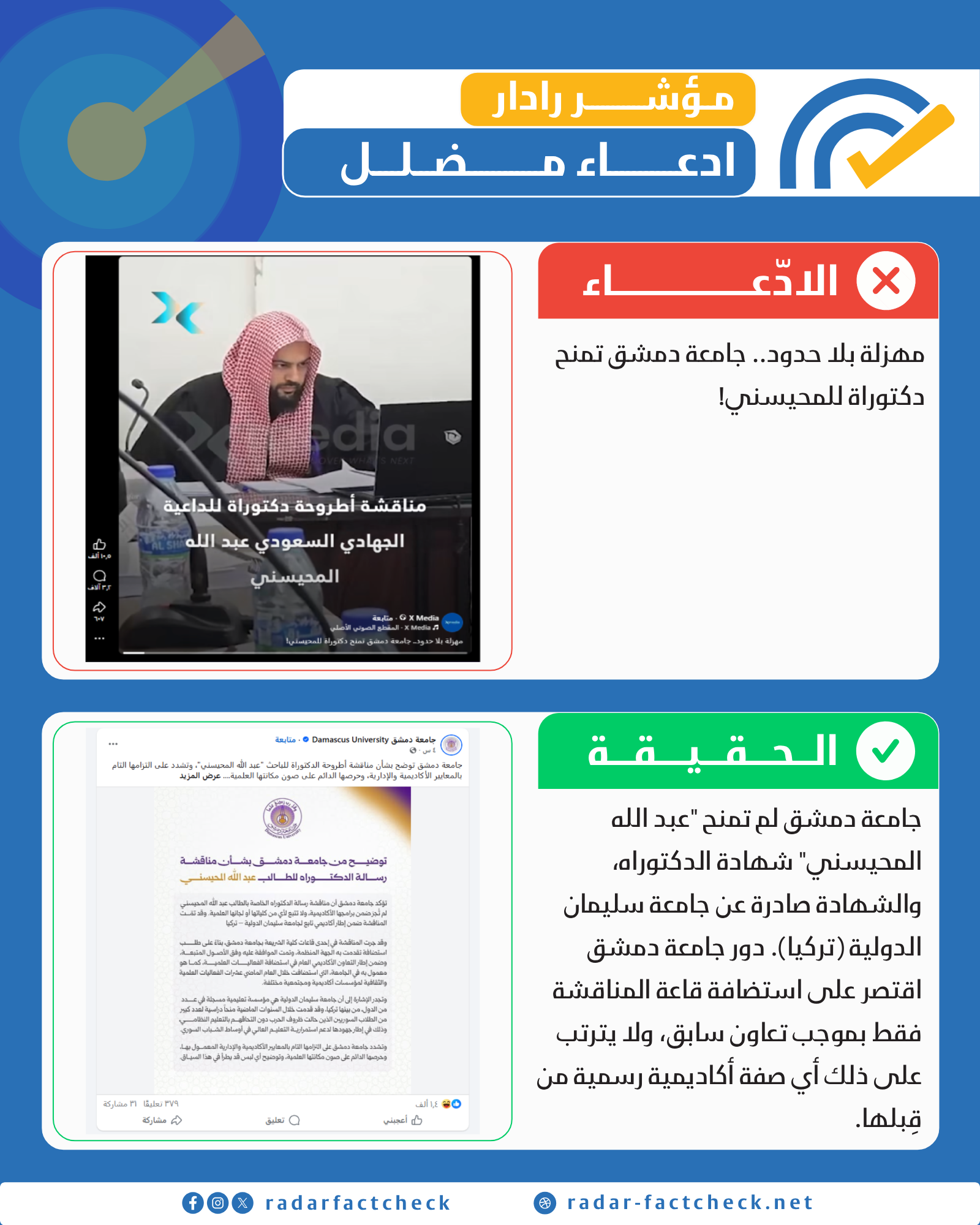 قام فريق "رادار" بمتابعة القضية، وتبين أن "عبد الله المحيسني" حصل بالفعل على شهادة الدكتوراه من جامعة سليمان الدولية (ومقرها تركيا) وليس من جامعة دمشق. وما جرى تداوله من مقاطع مصورة يعود لمناقشة الأطروحة التي استضافتها إحدى قاعات جامعة دمشق ضمن إطار تعاون علمي، دون أن يترتب على ذلك منح أي شهادة أو صفة أكاديمية صادرة عن جامعة دمشق نفسها، وهو ما أكدته الجامعة في بيانها الرسمي بنفي وجود أي سجل أكاديمي للمحيسني في برامجها البحثية الخاصة.