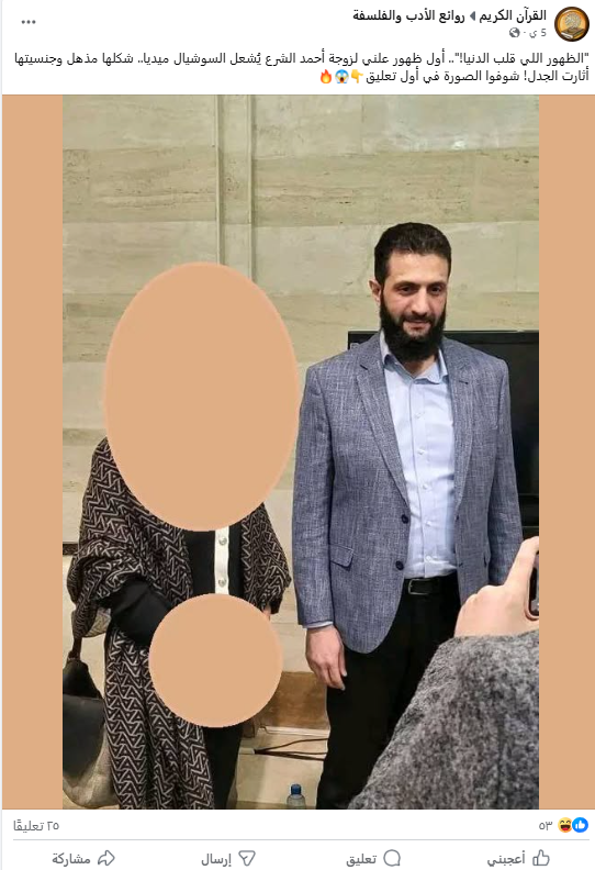 تداولت صفحات على منصة فيس بوك، صورة قالوا أنها “لأول ظهور علني لزوجة أحمد الشرع أشعل السوشيال ميديا شكلها مذهل وجنسيتها أثارت الجدل”.