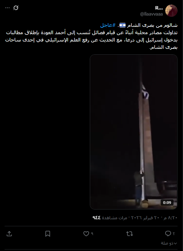 ضجّت منصات التواصل الاجتماعي بمقطع فيديو جرى تداوله على نطاق واسع، يظهر شخصاً يقوم برفع العلم الإسرائيلي ليلاً على سارية في ساحة عامة. وزعم ناشرو المقطع أن المشهد يوثق “رفع العلم الإسرائيلي في مدينة بصرى الشام بمحافظة درعا”، مدعين أن هذه الخطوة جاءت عقب اشتباكات عنيفة في المنطقة. كما ذهبت الادعاءات المرافقة إلى اتهام “فصائل تنسب للقيادي أحمد العودة” بالوقوف وراء هذا الفعل، مع الإيحاء بوجود مطالبات بتدخل إسرائيلي مباشر في الجنوب السوري. وقد أُعيد نشر الفيديو بصيغ متعددة لتعزيز سردية وجود تحولات في الاصطفافات العسكرية والسياسية بمحافظة درعا.