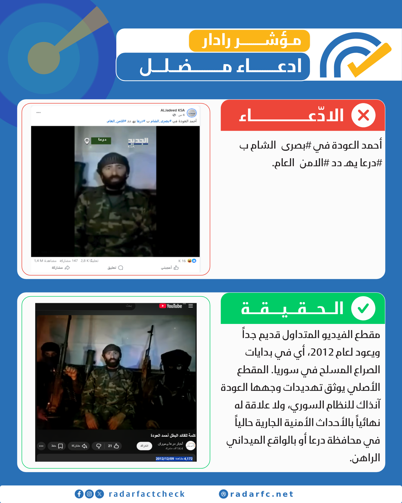 من خلال تتبع المصدر الأصلي للفيديو، وجدنا أن المقطع تم نشره وتداوله لأول مرة في عام 2012. وبمراجعة المحتوى، تبين أن الخطاب كان موجهاً ضد قوات النظام السوري في تلك الحقبة الزمنية، وليس ضد "الأمن العام" ضمن السياق الحالي. إن إعادة نشر مقطع يعود تاريخه إلى ما قبل 14 عاماً وتصويره على أنه "حدث عاجل" هو تضليل متعمد يهدف إلى تحريف حقيقة الصدام الميداني الحالي في بصرى الشام، وتصوير الخلافات الشخصية على أنها مواجهة مع أجهزة الدولة.