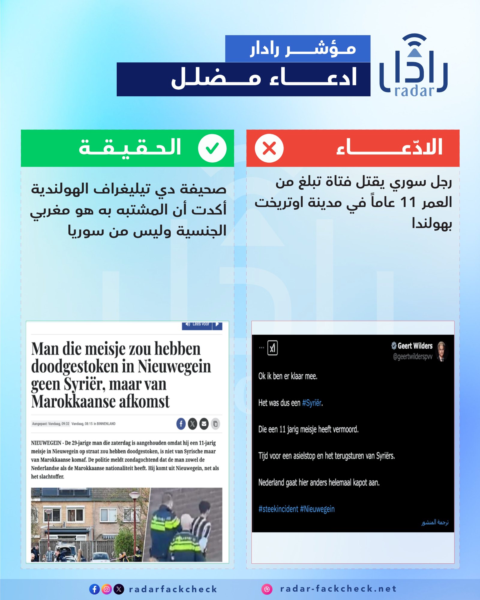 بحث فريق منصة رادار هذه الادعاءات وتبين أن الرجل الذي طعن الفتاة التي تبلغ من العمر 11 عاماً مغربي الجنسية حسب صحيفة تيليغراف الهولندية. وقالت شرطة اوتريخت، في الساعة الثالثة عصرًا، تلقّت الشرطة عدة بلاغات عن حادث طعن مروّع. وبعد وصول رجال الأمن وفرق الطوارئ إلى المكان، عُثر على فتاة تعاني من جروح بالغة في الشارع. وقد تعرّضت الفتاة للطعن بشكل وحشي، ورغم الجهود الكبيرة التي بذلها الفريق الطبي المتنقل وفرق الإنقاذ، لم تتمكن الفتاة من النجاة، حيث لفظت أنفاسها الأخيرة متأثرة بجروحها الخطيرة. في المنطقة القريبة من موقع الحادث، تمكنت الشرطة من القبض على مشتبه به يبلغ من العمر 29 عامًا، وذلك بناءً على معلومات قدمها المارة وأشخاص آخرون. وتم احتجاز الرجل للتحقيق في مدى تورطه في هذه الجريمة المأساوية.