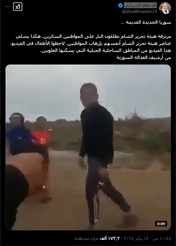 ادعت حسابات على منصة إكس أن عناصراً من هيئة تحرير الشام يطلقون الرصاص الحي على الأطفال السوريين في المناطق الساحلية الجبلية التي يسكنها العلويين.