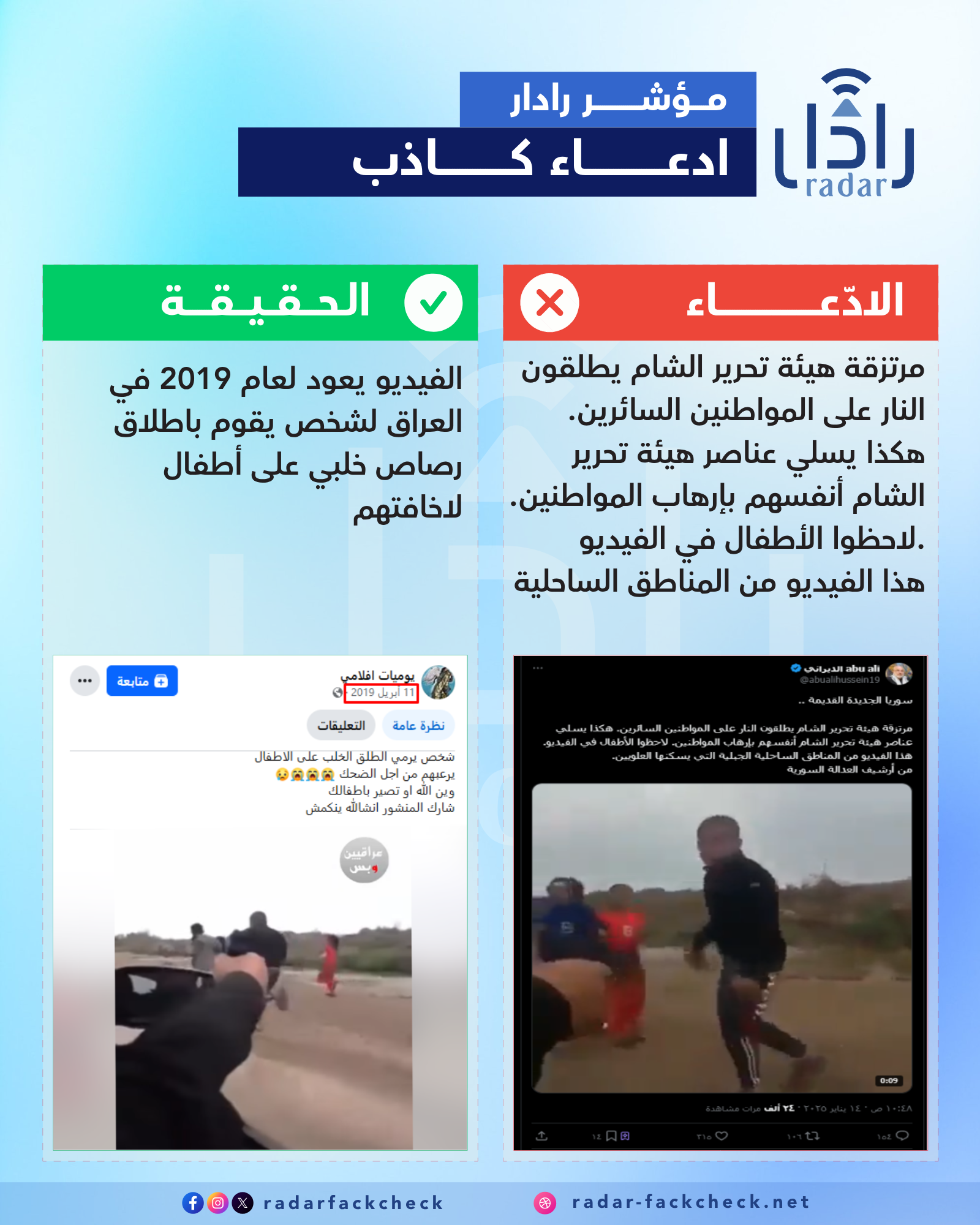 تحقق فريق منصة رادار من الفيديو، وتبين أنه ليس له علاقة بعناصر هيئة تحرير الشام، ولم يتم تصويره في سوريا. وهو فيديو قديم ويعود لتاريخ 2019 في العراق، لشخص عراقي يقوم باطلاق رصاص خلبي على أطفال في أحد طرقات العراق.