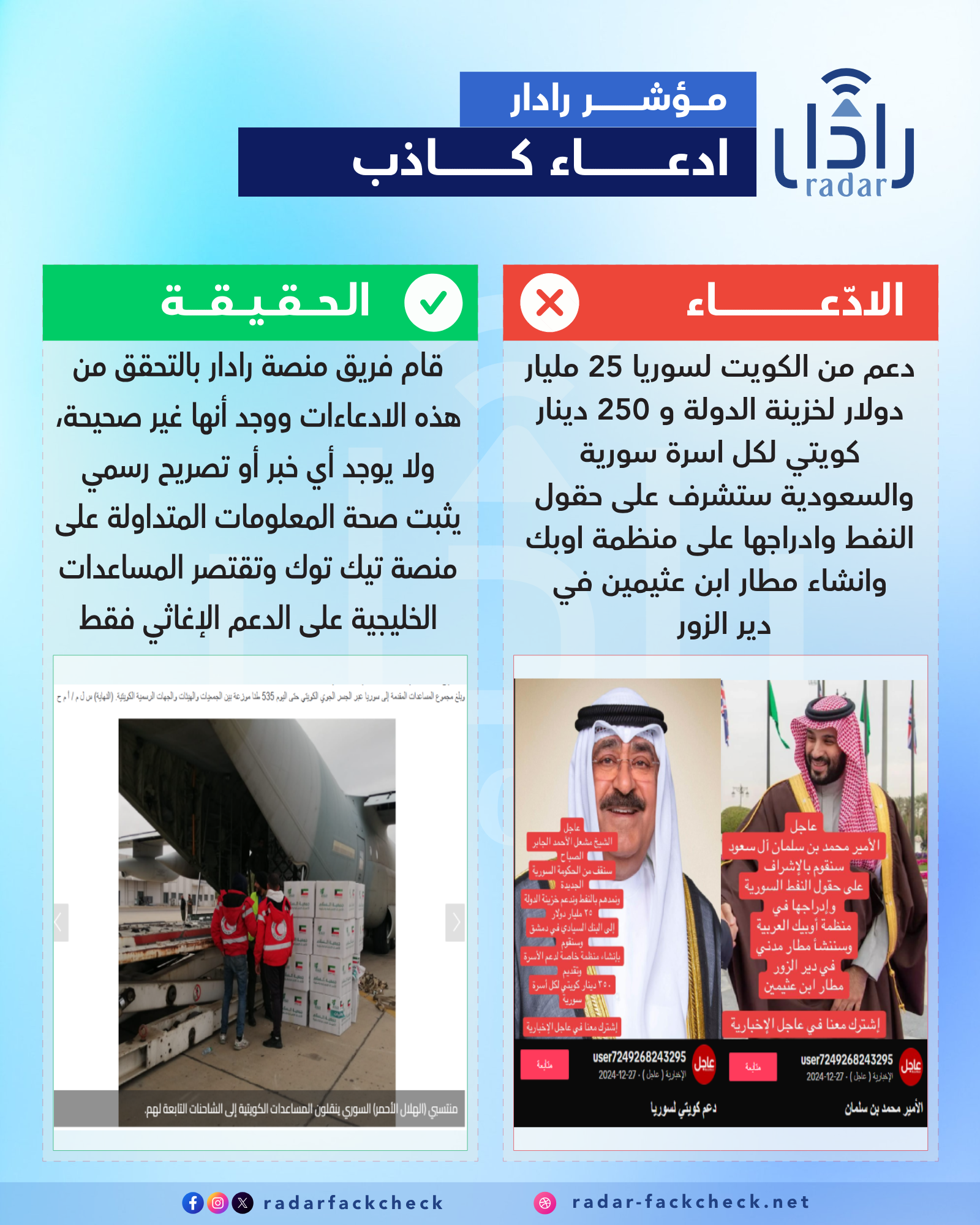 تداولت بعض الحسابات على منصات التواصل الاجتماعي مؤخراً ادعاءات تتعلق بتقديم الكويت 25 مليار دولار لدعم خزينة الدولة السورية، بالإضافة إلى أن السعودية بصدد إنشاء مطار مدني في دير الزور، وانتشرت بشكل واسع على منصة تيك توك.