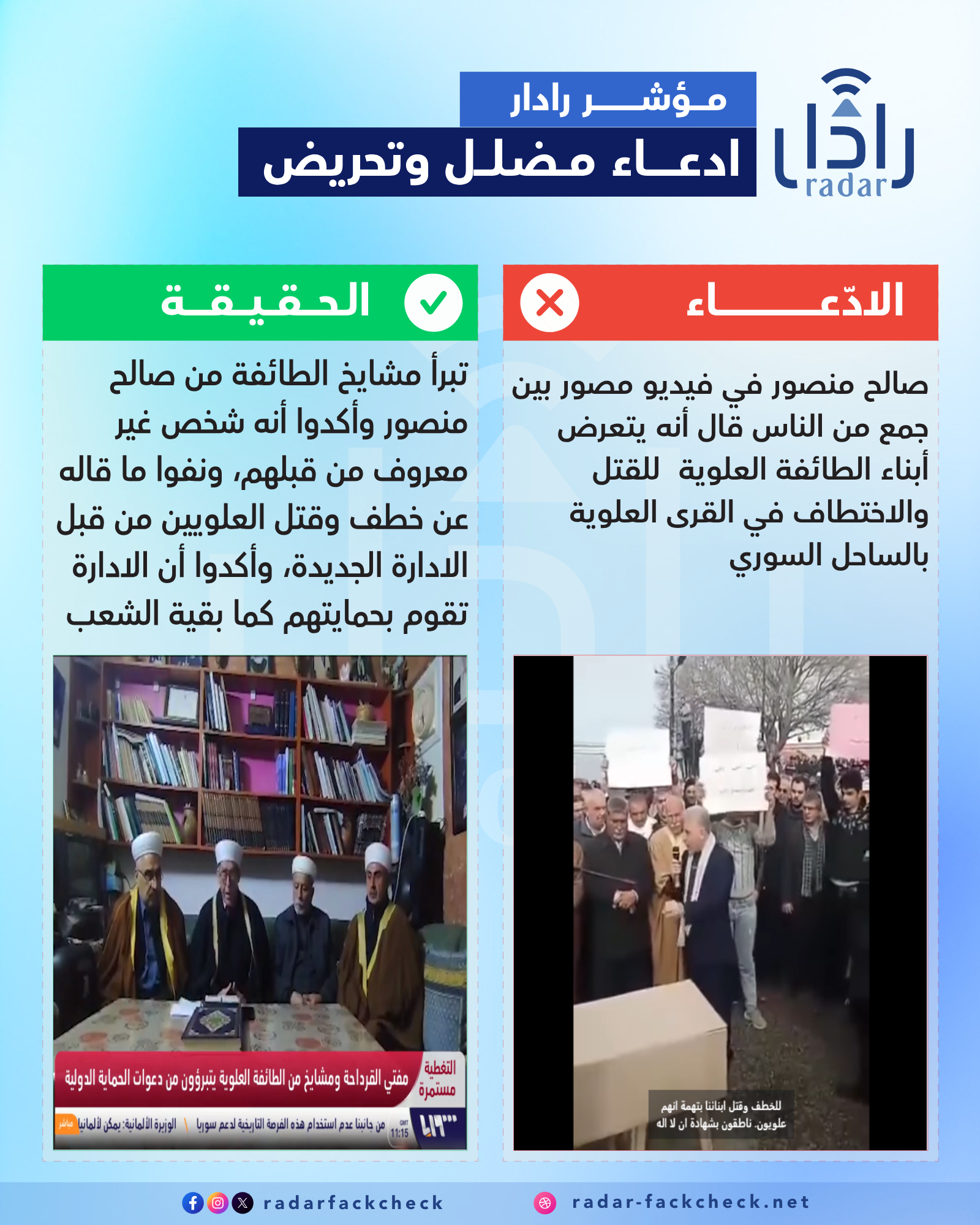 وكان المدعو صالح منصور ظهر بين جمع من الناس في فيديو مصور، أتهم القيادة الجديدة بخطف وقتل العلويين، ودعى لجمع تواقيع ملايين العلويين وتقديمها للأمم المتحدة، لطلب الحماية من فرنسا.