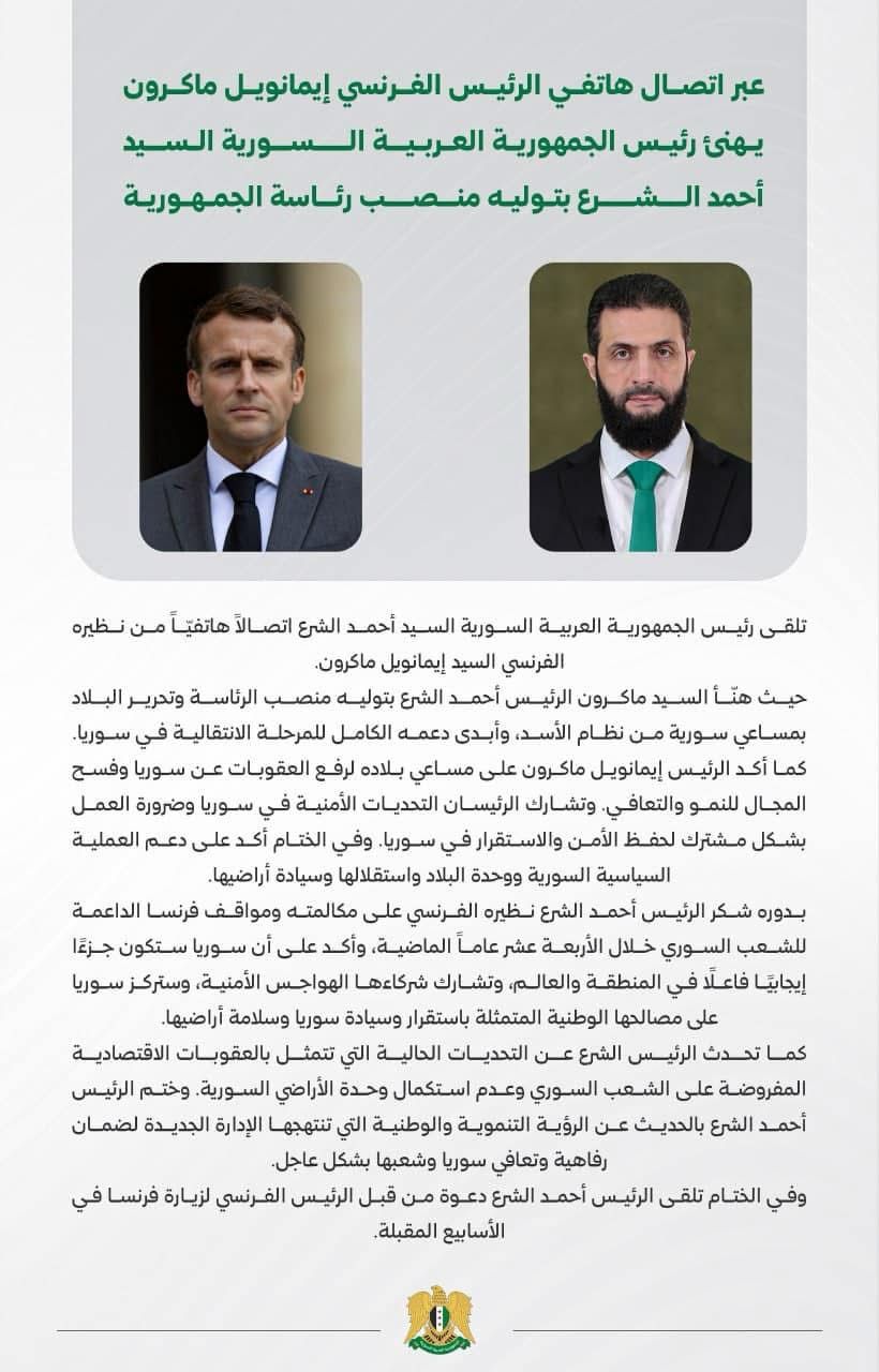 نقلت وكالات إعلامية وصحف وقنوات تلفزيونية عن رئاسة الجمهورية العربية السورية، خبرًا يفيد بتلقي الرئيس السوري أحمد الشرع مكالمة هاتفية من الرئيس الفرنسي إيمانويل ماكرون، حيث ناقشا خلالها الموضوعات المتعلقة بالمرحلة الانتقالية في سوريا ودور فرنسا في دعم هذه العملية. كما تضمن الخبر دعوة الرئيس الفرنسي لنظيره السوري لزيارة فرنسا في الأسابيع المقبلة.