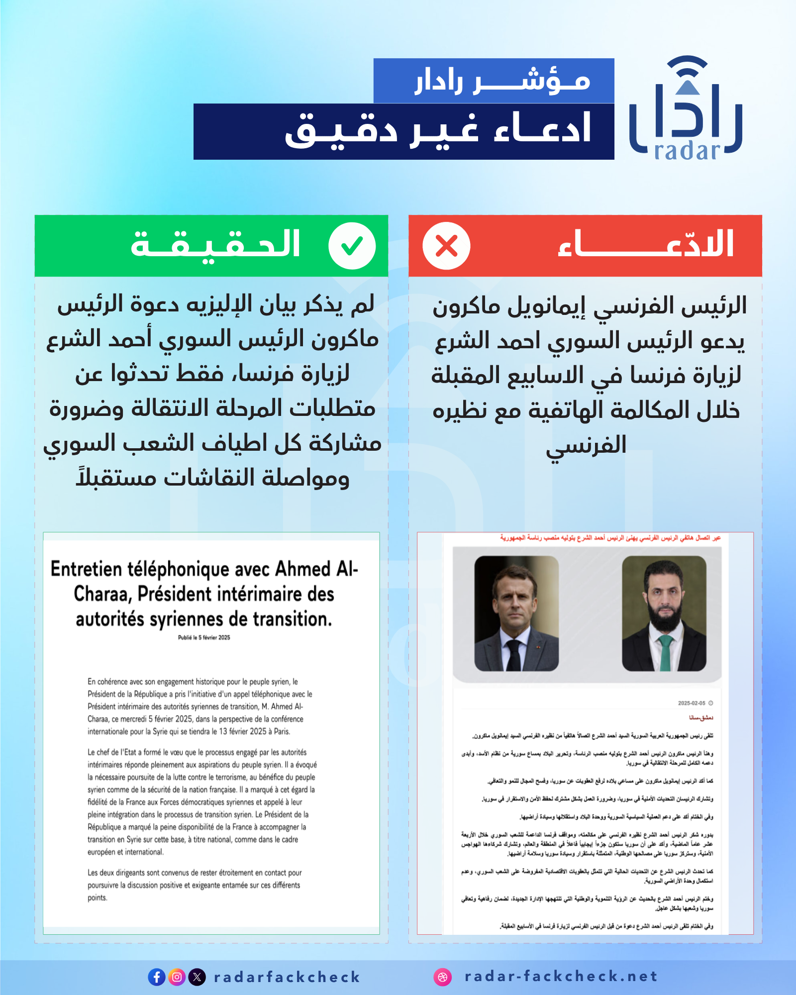 أجرى فريق منصة رادار بحثًا دقيقًا حول اللقاء الهاتفي بين الرئيسين الفرنسي والسوري، حيث ذكرت الرئاسة السورية في بيان نشرته على معرفاتها الرسمية أن الرئيس الفرنسي دعى نظيره السوري لزيارة فرنسا في الاسابيع المقبلة، وفي حين لم نجد أي معلومات أو مصادر فرنسية تثبت أن الرئيس الفرنسي قام بدعوة الرئيس السوري لزيارة فرنسا في الاسابيع المقبلة، وفقًا للبيان الرسمي الصادر عن الإليزيه وموقع TFI Info الفرنسي المعروف. وبحسب بيان الإليزيه، تناول الرئيسان في مكالمتهما الهاتفية عدة قضايا هامة، من بينها المرحلة الانتقالية في سوريا، وتلبية تطلعات الشعب السوري، بالإضافة إلى التعاون في مكافحة الإرهاب ودمج قوات سوريا الديمقراطية (قسد) في العملية السياسية. كما أبدت فرنسا استعدادها لدعم هذه المرحلة الانتقالية. صحف فرنسية مثل لوفيغارو نقلت عن مصادر من الإليزيه أن ماكرون نقل رسالة للشرع بأنه "مرحب به" في حين لم يتضمن نص البيان الرسمي ذلك.