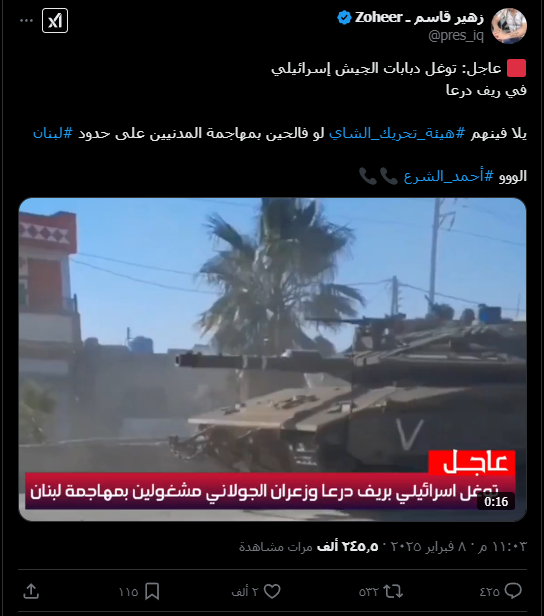 تداولت حسابات على منصة إكس، فيديو لتوغل دبابات للجيش الإسرائيلي في ريف مدينة درعا خلال اليومين الماضيين، ولاقى انتشار واسع.