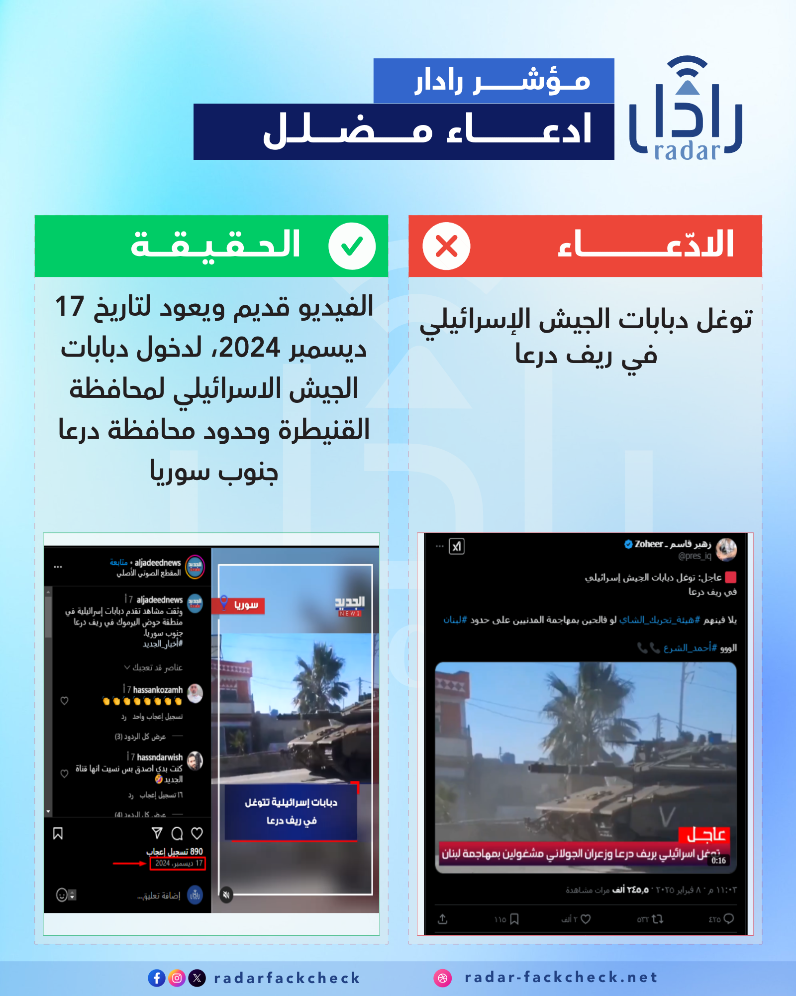 قام فريق منصة رادار بتدقيق الفيديو وتأكد من أنه يعود لتاريخ 17 ديسمبر 2024، ويُظهر دخول دبابات الجيش الإسرائيلي إلى الشريط الحدودي، وغادرت الحدود في نفس اليوم.