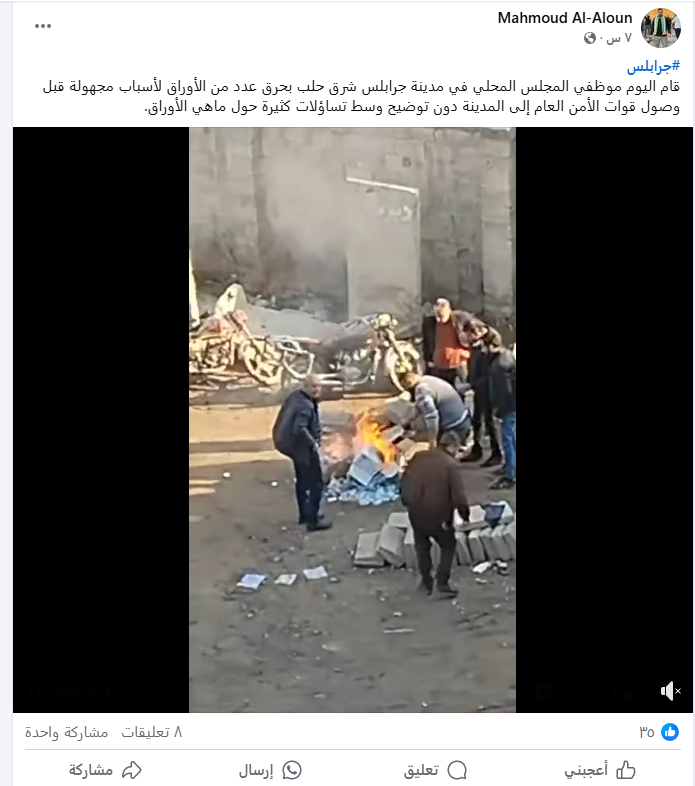 تداولت صفحات على منصة فيس بوك، تسجيل مصور يظهر موظفي المجلس المحلي لمدينة جرابلس يقومون بحرق أوراق لأسباب مجهولة قبل وصول قوات الأمن العام إلى المدينة دون توضيح وسط تساؤلات كثيرة حول ماهي الأوراق.