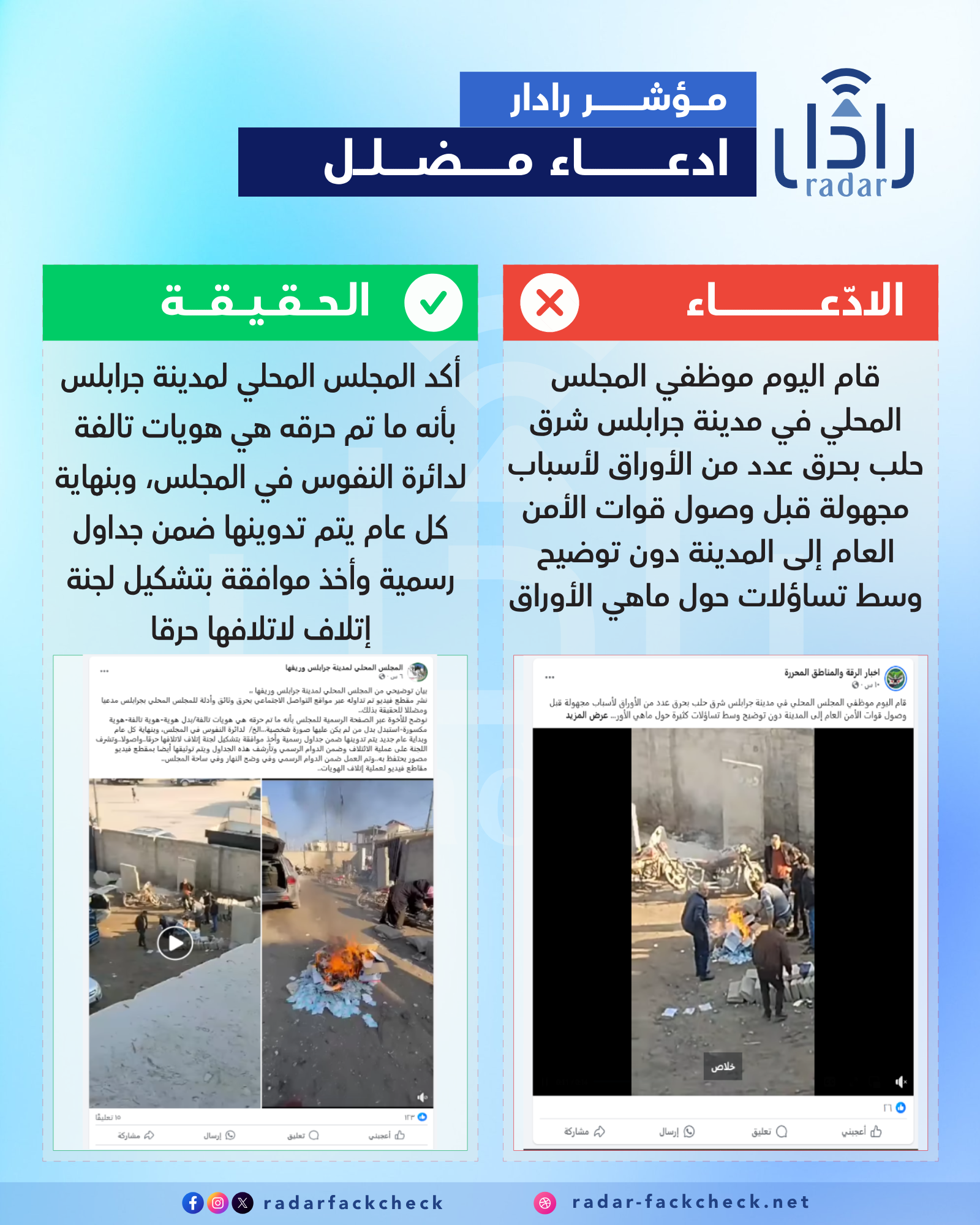 بحث فريق منصة رادار عن الفيديو، ووجد أن الصفحة الرسمية للمجلس المحلي لمدينة جرابلس أكدت عبر منشور أن "ما تم حرقه هي هويات تالفة/بدل هوية-هوية تالفة-هوية مكسورة-استبدل بدل من لم يكن عليها صورة شخصية...الخ/ لدائرة النفوس في المجلس، وبنهاية كل عام وبداية عام جديد يتم تدوينها ضمن جداول رسمية وأخذ موافقة بتشكيل لجنة إتلاف لاتلافها حرقا..واصولا..وتشرف اللجنة على عملية الائتلاف وضمن الدوام الرسمي وتأرشف هذه الجداول ويتم توثيقها أيضا بمقطع فيديو مصور يحتفظ به..وتم العمل ضمن الدوام الرسمي وفي وضح النهار وفي ساحة المجلس".